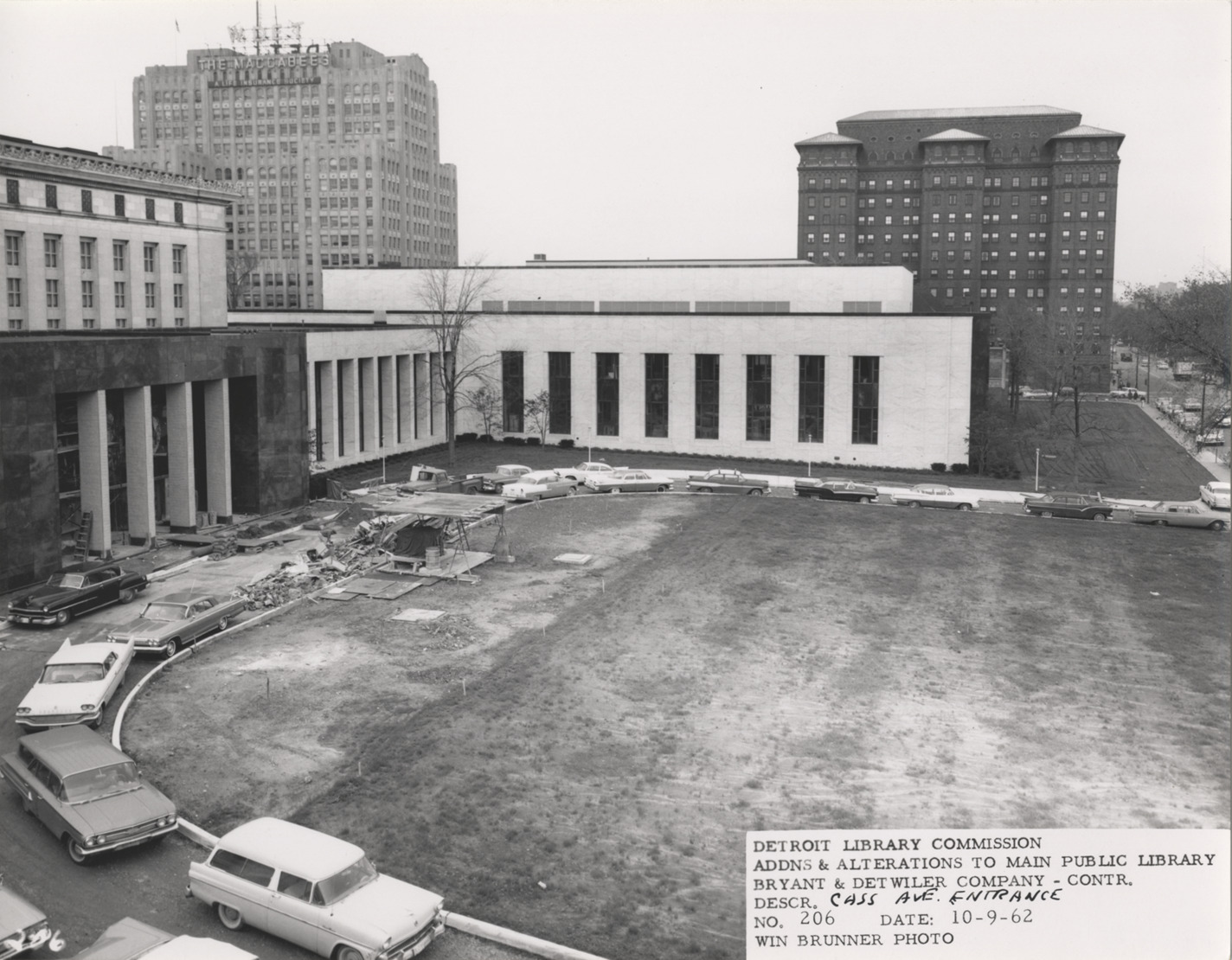 View of Cass Avenue entrance to Main Library, Detroit Public Library during construction. Automobiles parked in driveway; pile of debris in front of entrance. Maccabees building in background. Printed on front: "Detroit Library Commission. Addns & alterations to Main Public Library. Bryant & Detwiler Company, contr. Descr. Cass Ave. entrance. No. 206. Date: 10-09-62. Win Brunner, photo."