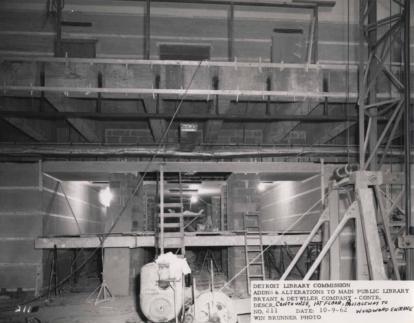View of Cass Ave. concourse, Main Library, Detroit Public Library during construction. Printed on front: "Detroit Library Commission. Addns & alterations to Main Public Library. Bryant & Detwiler Company, contr. Descr. concourse, 1st floor, passageway to Woodward entrance. No. 211. Date: 10-09-62. Win Brunner, photo."