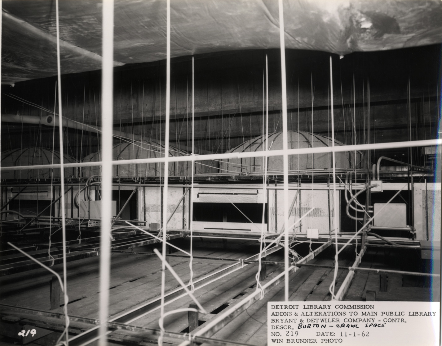 View of crawlspace above Burton Historical Collection, Main Library, Detroit Public Library during construction. Printed on front: "Detroit Library Commission. Addns & alterations to Main Public Library. Bryant & Detwiler Company, contr. Descr. Burton, crawl space. No. 219. Date: 11-1-62. Win Brunner, photo."