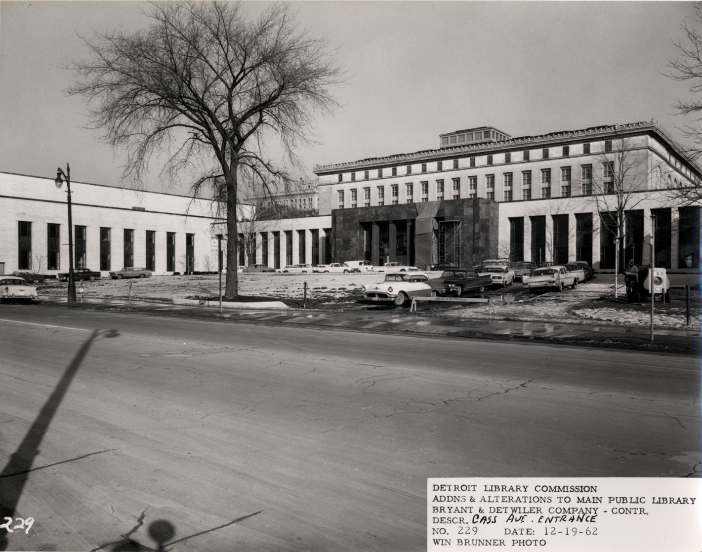 View of Cass Avenue entrance, Main Library, Detroit Public Library during construction. Scaffolding outside of entrance; cars parked in circular driveway. Printed on front: "Detroit Library Commission. Addns & alterations to Main Public Library. Bryant & Detwiler Company, contr. Descr. Cass Ave. entrance. No. 229. Date: 12-19-62. Win Brunner, photo."