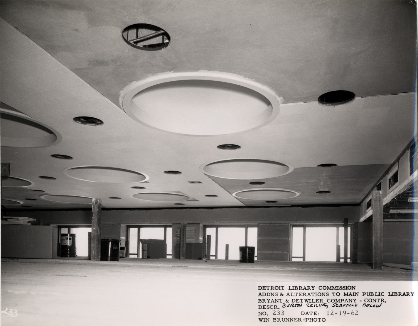 View of Burton Historical collection ceiling from top of scaffolding, Main Library, Detroit Public Library during construction. Areas for light fixtures visible in ceiling. Printed on front: "Detroit Library Commission. Addns & alterations to Main Public Library. Bryant & Detwiler Company, contr. Descr. Burton ceiling, scaffold below. No. 233. Date: 12-19-62. Win Brunner, photo."