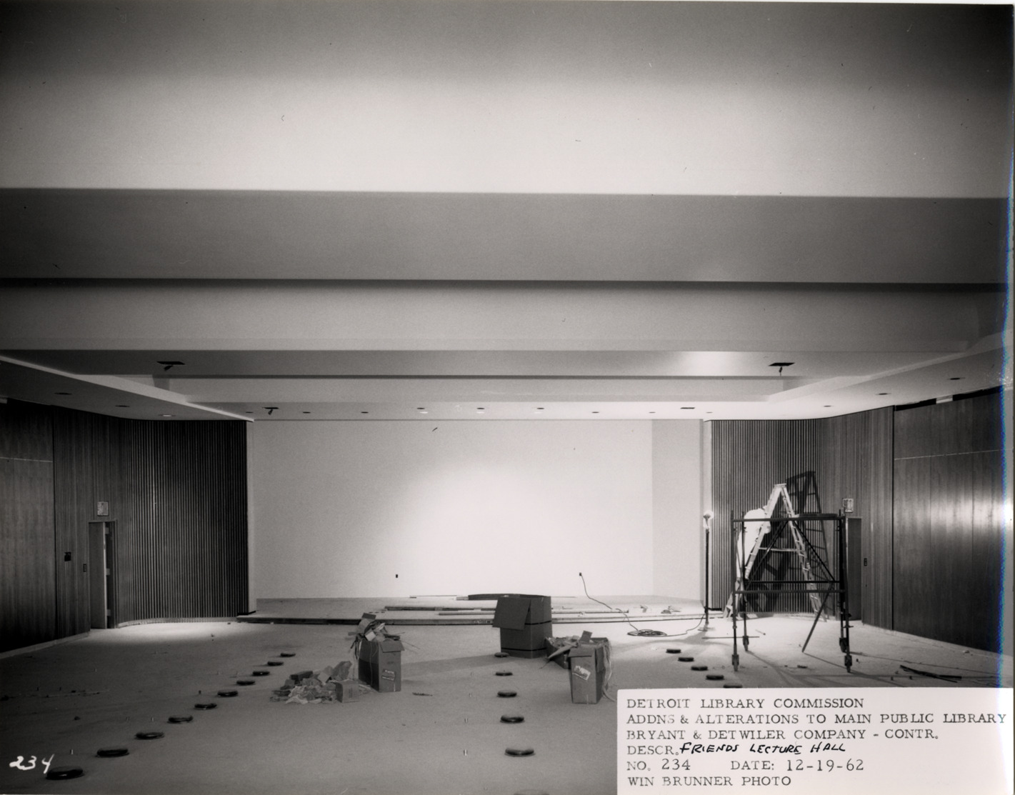 View of Friends Auditorium, Main Library, Detroit Public Library during construction. Construction worker stands on ladder near stage. Printed on front: "Detroit Library Commission. Addns & alterations to Main Public Library. Bryant & Detwiler Company, contr. Descr. Friends lecture hall. No. 234. Date: 12-19-62. Win Brunner, photo."