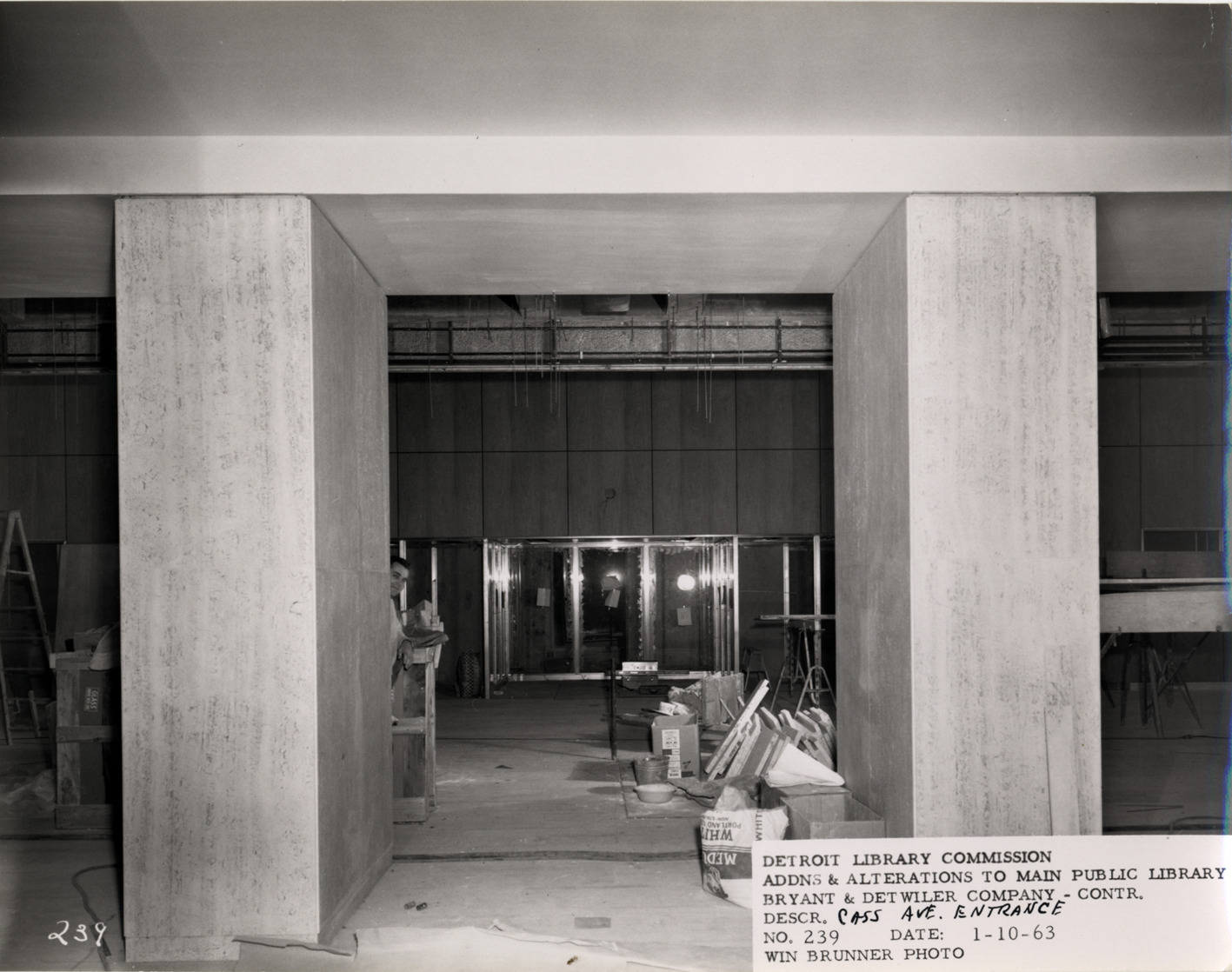 Interior view of Cass Avenue entrance, Main Library, Detroit Public Library during construction. Construction worker stands behind column; construction materials on floor. Printed on front: "Detroit Library Commission. Addns & alterations to Main Public Library. Bryant & Detwiler Company, contr. Descr. Cass Ave. entrance. No. 239. Date: 1-10-63. Win Brunner, photo."