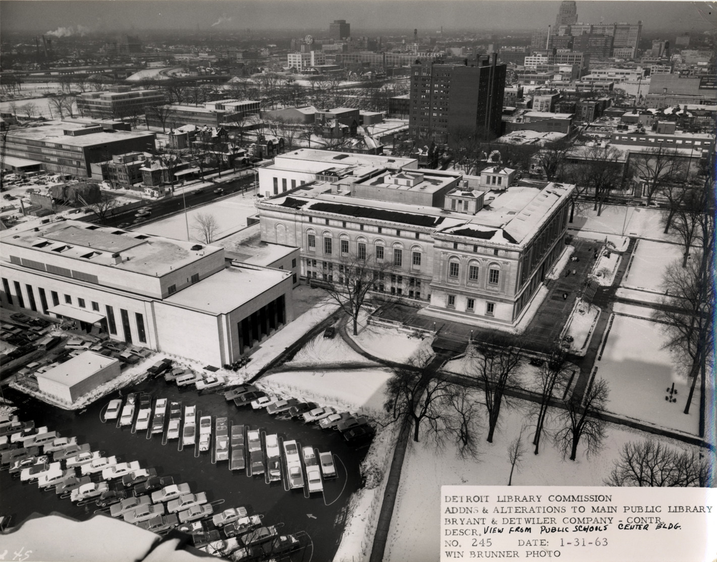 Bird's-eye view of Main Library and parking lot, Detroit Public Library. Printed on front: "Detroit Library Commission. Addns & alterations to Main Public Library. Bryant & Detwiler Company, contr. Descr. view from Public Schools Center Bldg. No. 245. Date: 1-31-63. Win Brunner, photo."