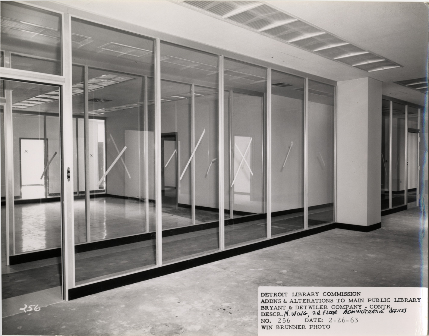 View of glass partition outside of administrative offices, Main Library, Detroit Public Library during construction. Printed on front: "Detroit Library Commission. Addns & alterations to Main Public Library. Bryant & Detwiler Company, contr. Descr. N. Wing, 2d floor, administrative offices. No. 256. Date: 2-26-63. Win Brunner, photo."