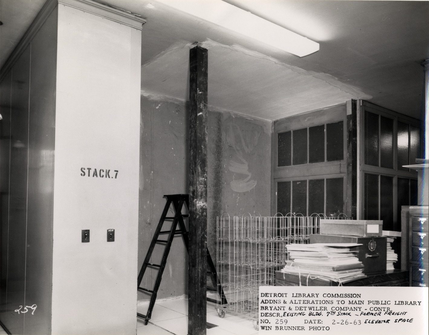 View of stack 7, Main Library, Detroit Public Library during construction. Ladder, book trucks and card catalog cabinet in room. Bookshelf labeled: "Stack 7." Printed on front: "Detroit Library Commission. Addns & alterations to Main Public Library. Bryant & Detwiler Company, contr. Descr. existing bldg., 7th stack, former freight elevator space. No. 259. Date: 2-26-63. Win Brunner, photo."