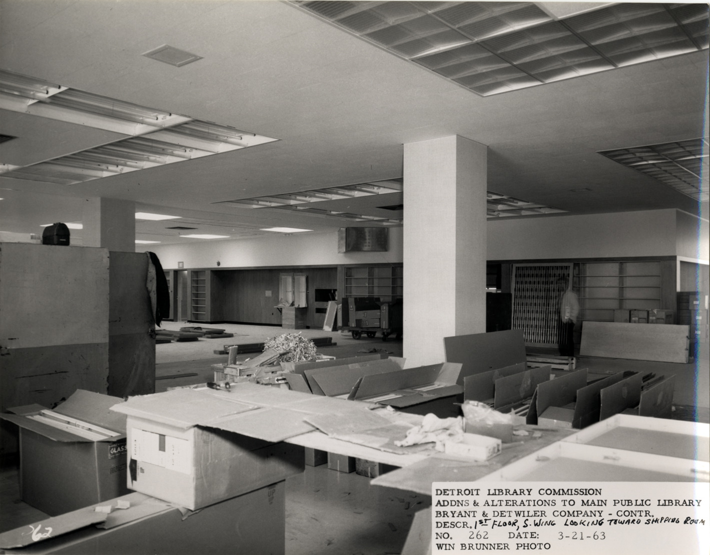 View of first floor, South Wing, Main Library, Detroit Public Library during construction. Room is filled with boxes. Printed on front: "Detroit Library Commission. Addns & alterations to Main Public Library. Bryant & Detwiler Company, contr. Descr. 1st floor, S. Wing, looking toward shipping room. No. 262. Date: 3-21-63. Win Brunner, photo."