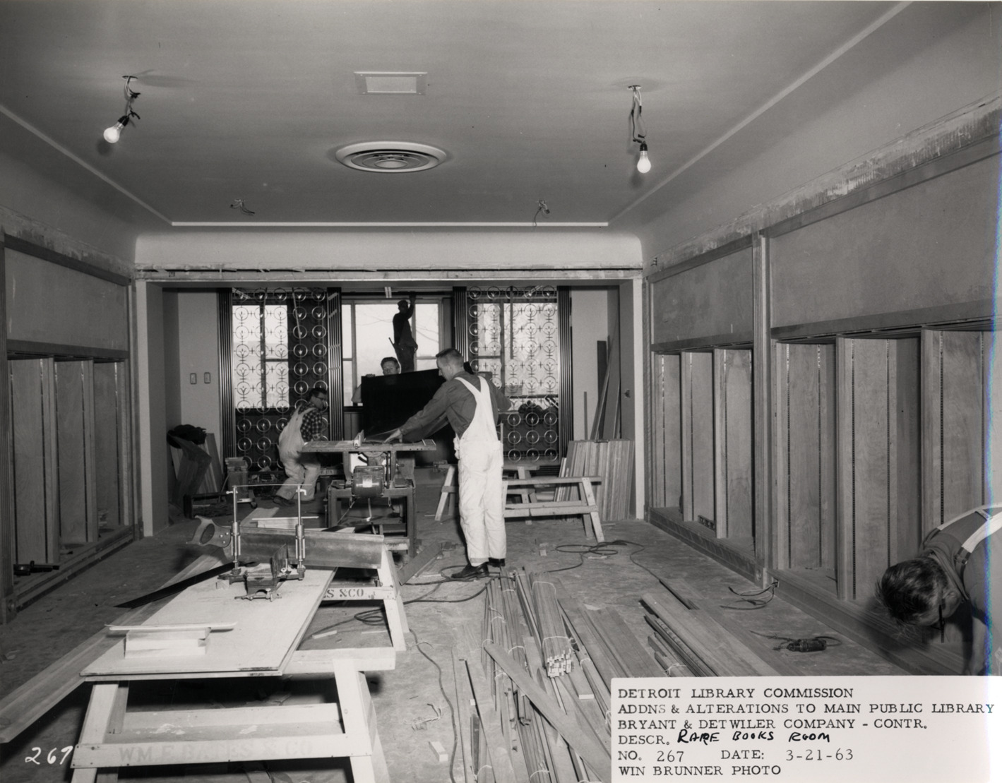 View of construction workers working in Rare Book Room, Main Library, Detroit Public Library. Building materials in room. Printed on front: "Detroit Library Commission. Addns & alterations to Main Public Library. Bryant & Detwiler Company, contr. Descr. Rare Books room. No. 267. Date: 3-21-63. Win Brunner, photo."