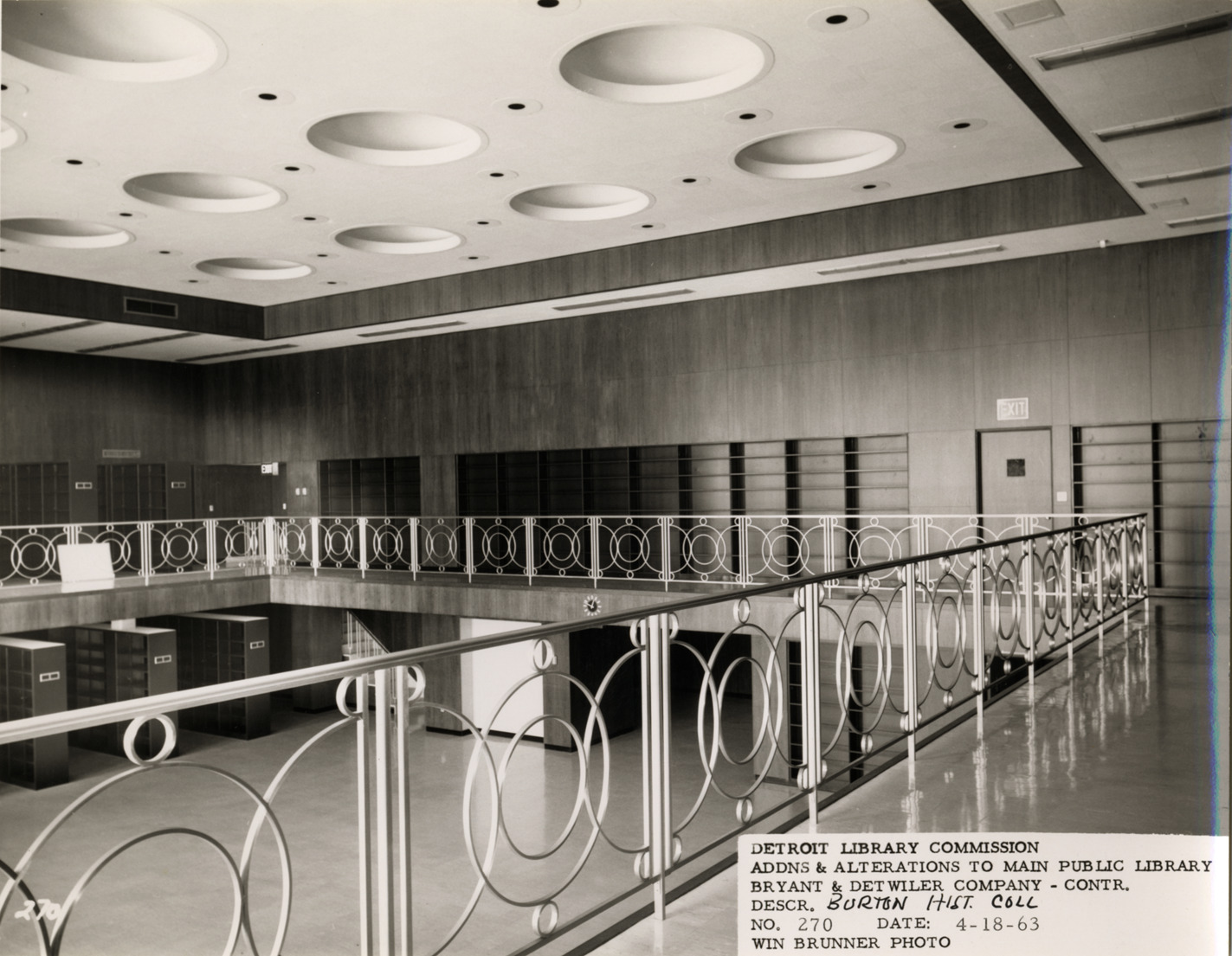 View of Burton Historical Collection, Main Library, Detroit Public Library showing brass balcony railing and empty bookshelves. Printed on front: "Detroit Library Commission. Addns & alterations to Main Public Library. Bryant & Detwiler Company, contr. Descr. Burton Historical Collection. No. 270. Date: 4-18-63. Win Brunner, photo."