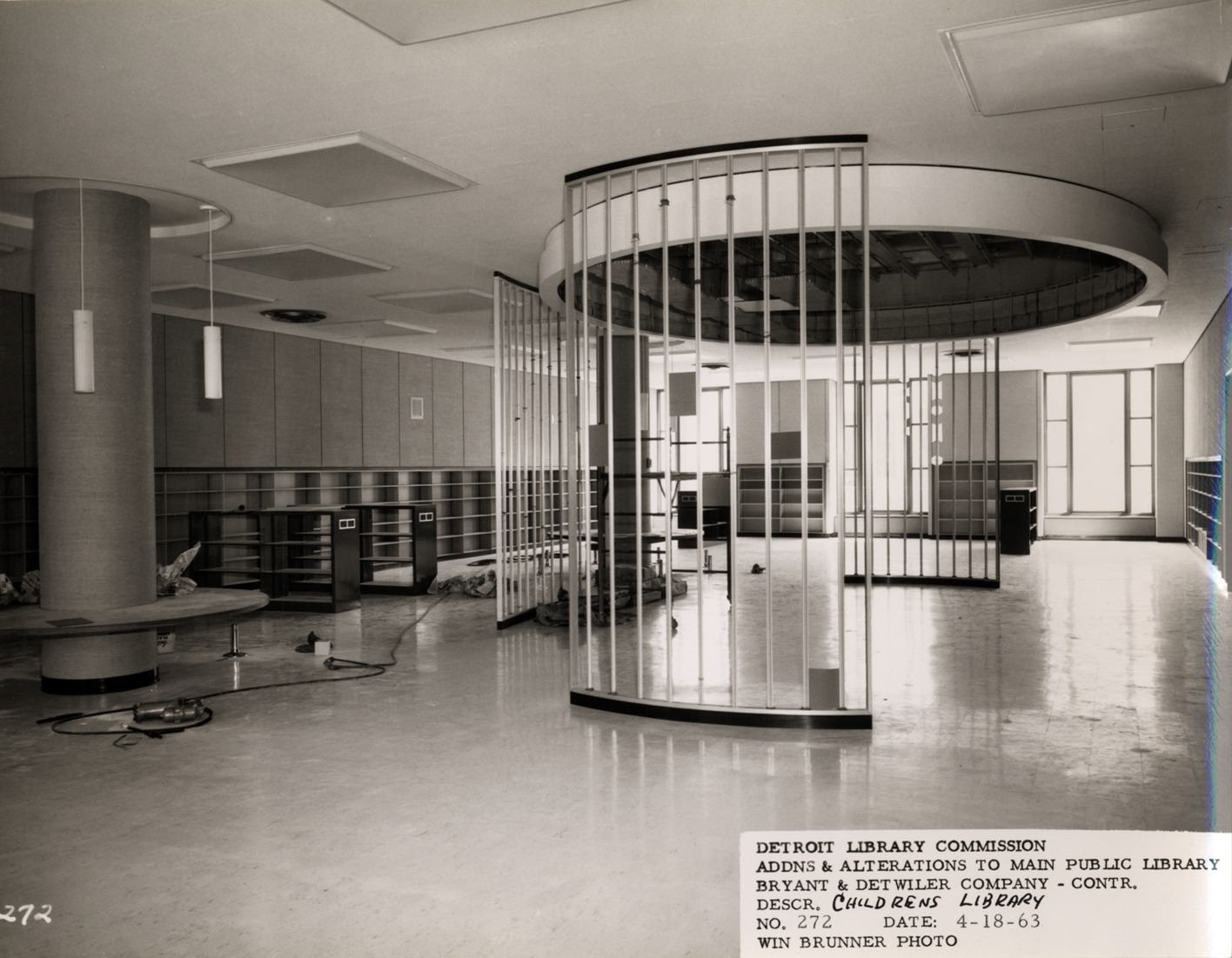 View of Children's Library, Main Library, Detroit Public Library during construction, showing room partitions and empty bookshelves. Printed on front: "Detroit Library Commission. Addns & alterations to Main Public Library. Bryant & Detwiler Company, contr. Descr. Childrens Library. No. 272. Date: 4-18-63. Win Brunner, photo."