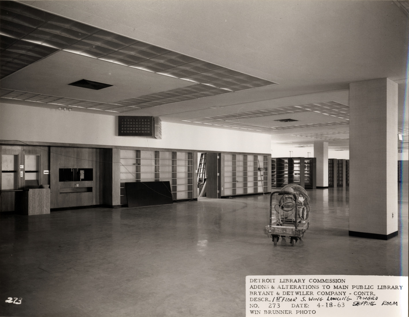 View of first floor, South Wing, Main Library, Detroit Public Library during construction, showing empty bookshelves. Unidentified equipment on cart. Printed on front: "Detroit Library Commission. Addns & alterations to Main Public Library. Bryant & Detwiler Company, contr. Descr. 1st floor, S. Wing, looking toward shipping room. No. 273. Date: 4-18-63. Win Brunner, photo."