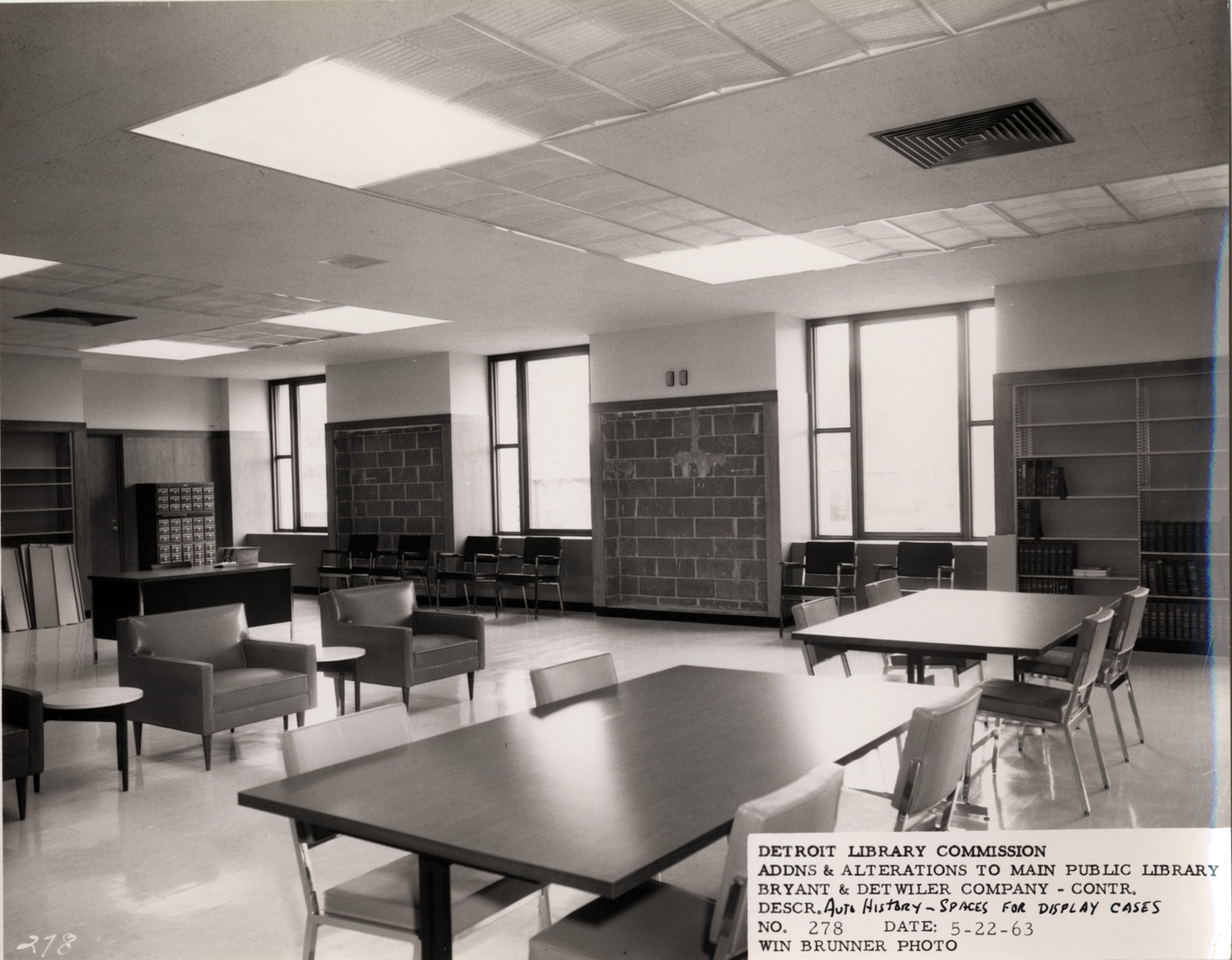 View of National Automotive History Collection, Main Library, Detroit Public Library. Tables and chairs installed in room; empty wall space designated for exhibit cases. Printed on front: "Detroit Library Commission. Addns & alterations to Main Public Library. Bryant & Detwiler Company, contr. Descr. Auto History, spaces for display cases. No. 278. Date: 5-22-63. Win Brunner, photo."