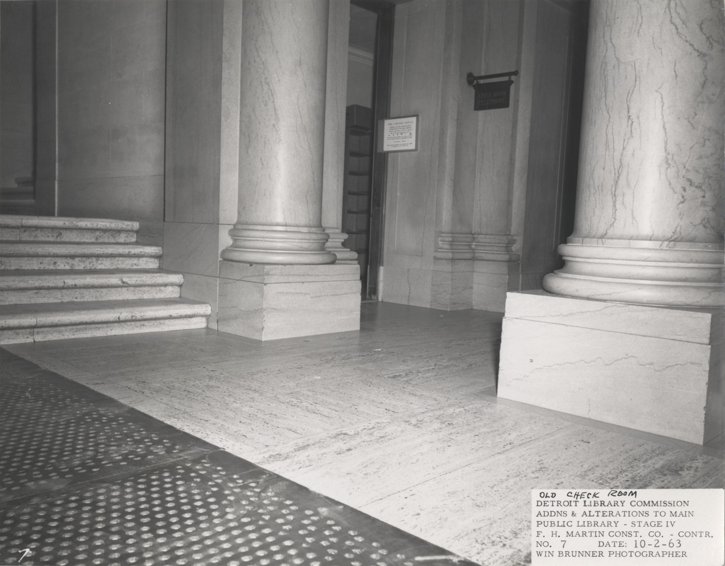 View of entrance to checkroom, Main Library, Detroit Public Library. Columns in front; signs on wall: "Check room, telephone" and "Free checking service." Printed on front: "Old check room. Detroit Library Commission. Addns & alterations to Main Public Library, Stage IV. F.H. Martin Const. Co., contr. No. 7. Date: 10-2-63. Win Brunner, photographer."