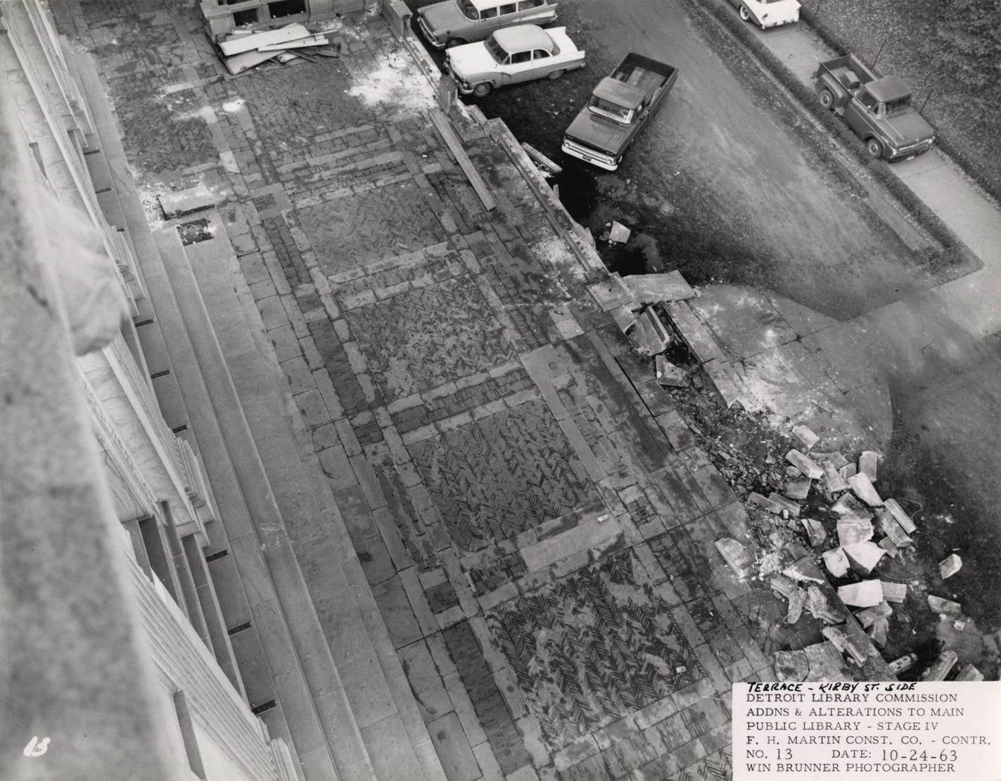 View from above of Kirby St. terrace in process of being demolished, Main Library, Detroit Public Library. Automobiles and trucks parked in front of terrace; construction debris in foreground. Printed on front: "Terrace, Kirby St. side. Detroit Library Commission. Addns & alterations to Main Public Library, Stage IV. F.H. Martin Const. Co., contr. No. 13. Date: 10-24-63. Win Brunner, photographer."