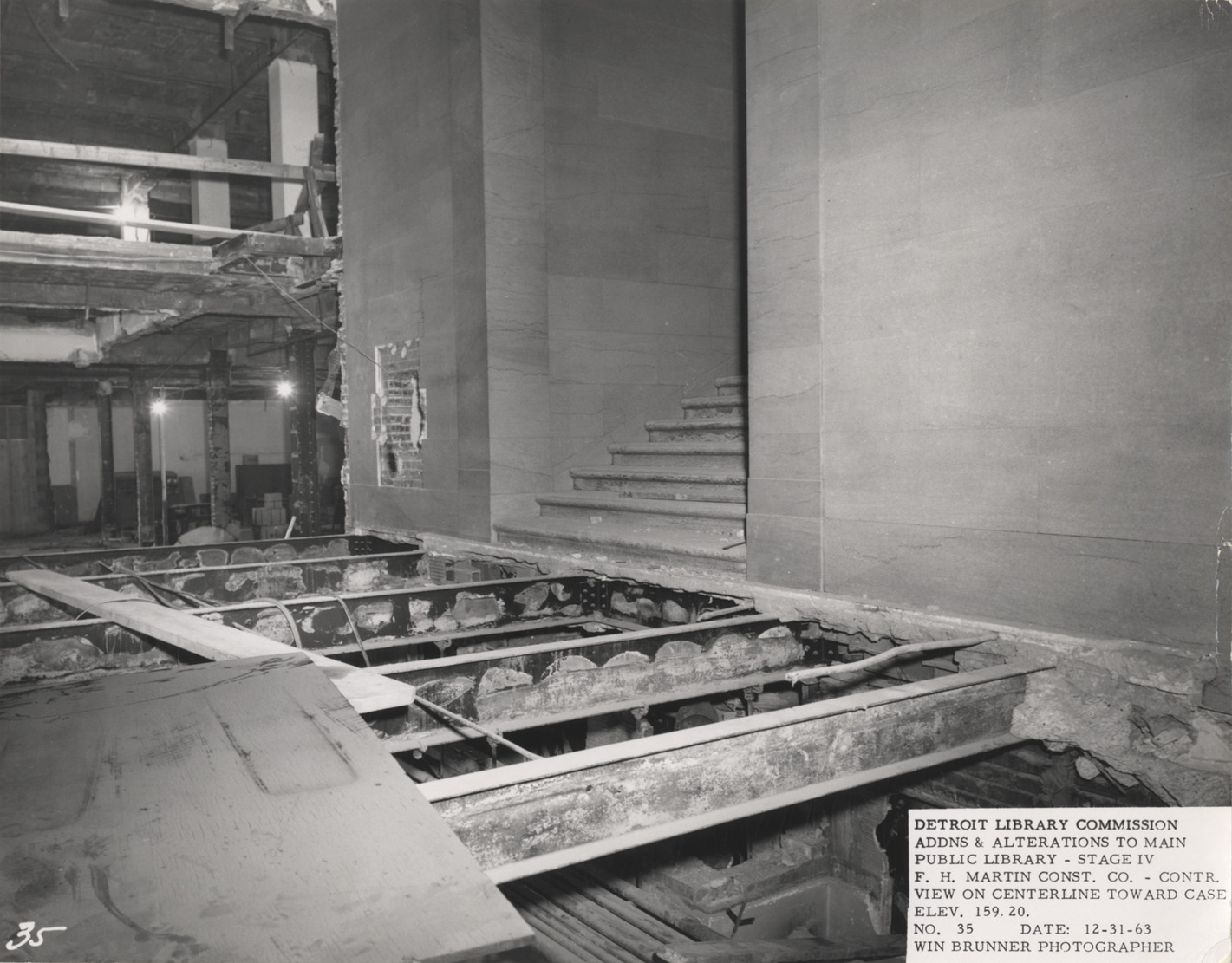 View of staircase landing, Main Library, Detroit Public Library during construction. Printed on front: "Detroit Library Commission. Addns & alterations to Main Public Library, Stage IV. F.H. Martin Const. Co., contr. View on centerline toward case elev. 159.20. No. 35. Date: 12-31-63. Win Brunner, photographer."