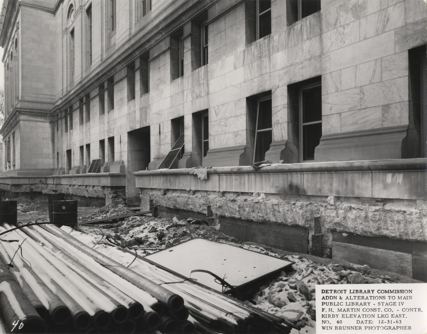 View of Kirby St. side of Main Library, Detroit Public Library during construction. Building foundation is exposed; pipes on ground. Printed on front: "Detroit Library Commission. Addns & alterations to Main Public Library, Stage IV. F.H. Martin Const. Co., contr. Kirby elevation lkg. east. No. 40. Date: 12-31-63. Win Brunner, photographer."