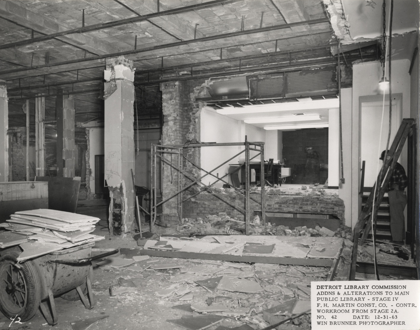 View of workroom, Main Library, Detroit Public Library during construction. Desk and chair on platform; construction worker stands on right. Drywall debris and scaffolding in foreground. Printed on front: "Detroit Library Commission. Addns & alterations to Main Public Library, Stage IV. F.H. Martin Const. Co., contr. Workroom from stage 2A. No. 42. Date: 12-31-63. Win Brunner, photographer."