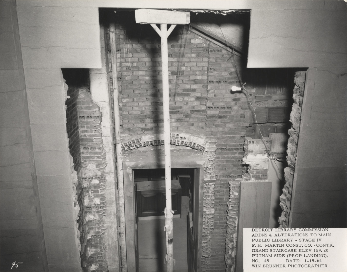 View of grand staircase wall, Main Library, Detroit Public Library during construction. Vertical pipe in front of doorway in exposed brick wall. Printed on front: "Detroit Library Commission. Addns & alterations to Main Public Library, Stage IV. F.H. Martin Const. Co., contr. Grand staircase, elev. 159.20, Putnam side (prop landing). No. 45. Date: 1-15-64. Win Brunner, photographer."