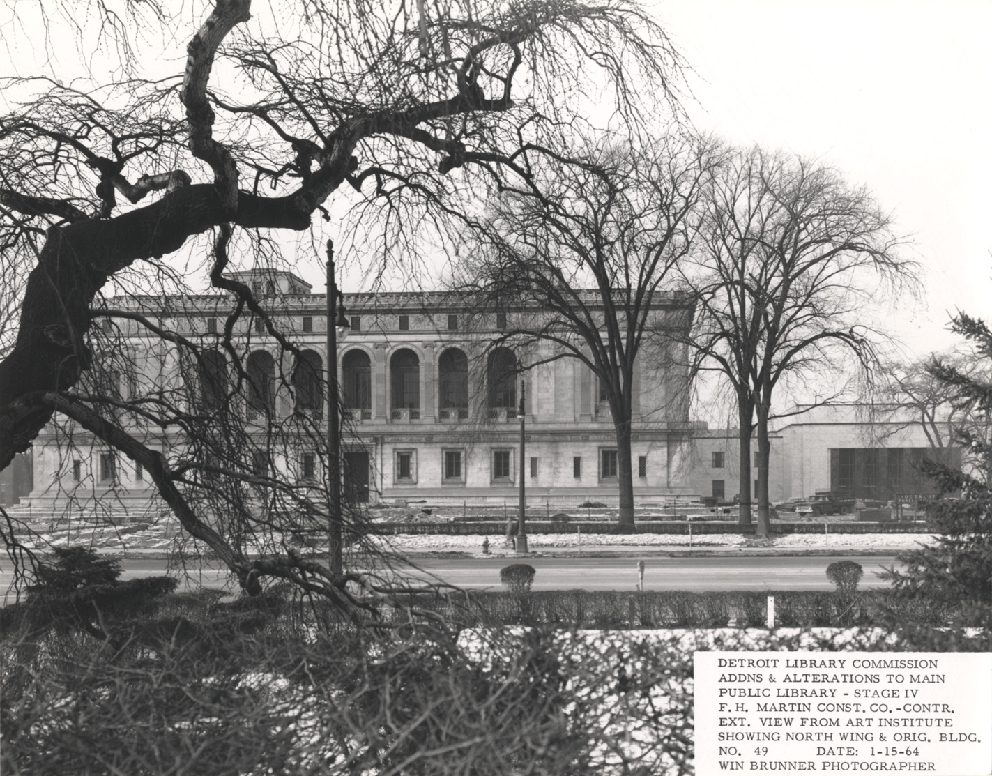 View of Main Library and North Wing, Detroit Public Library. Building is partially obscured by trees. Printed on front: "Detroit Library Commission. Addns & alterations to Main Public Library, Stage IV. F.H. Martin Const. Co., contr. Ext. view from Art Institute showing North Wing & orig. bldg. No. 49. Date: 1-15-64. Win Brunner, photographer."