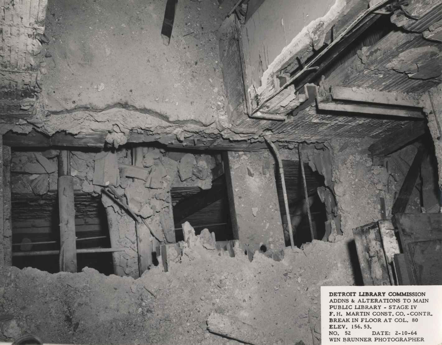 View of break in floor, Main Library, Detroit Public Library during construction. Printed on front: "Detroit Library Commission. Addns & alterations to Main Public Library, Stage IV. F.H. Martin Const. Co., contr. Break in floor at col. 80, elev. 156.53. No. 52. Date: 2-10-64. Win Brunner, photographer."