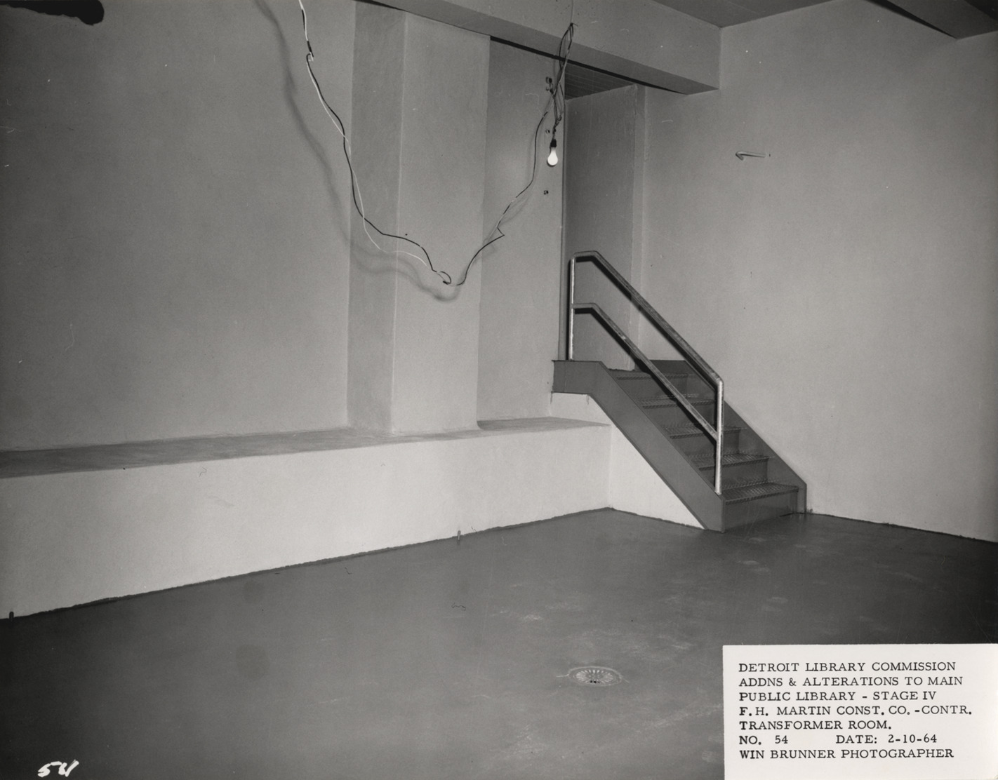 View of transformer room, Main Library, Detroit Public Library during construction. Stairs in corner of room. Printed on front: "Detroit Library Commission. Addns & alterations to Main Public Library, Stage IV. F.H. Martin Const. Co., contr. Transformer rom. No. 54. Date: 2-10-64. Win Brunner, photographer."
