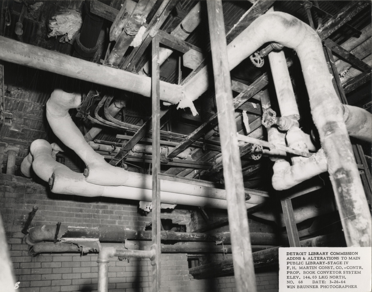View of book conveyor system, Main Library, Detroit Public Library. Printed on front: "Detroit Library Commission. Addns & alterations to Main Public Library, Stage IV. F.H. Martin Const. Co., contr. Prop. book conveyor system, elev. 144.03 lkg. north. No. 68. Date: 3-26-64. Win Brunner, photographer."