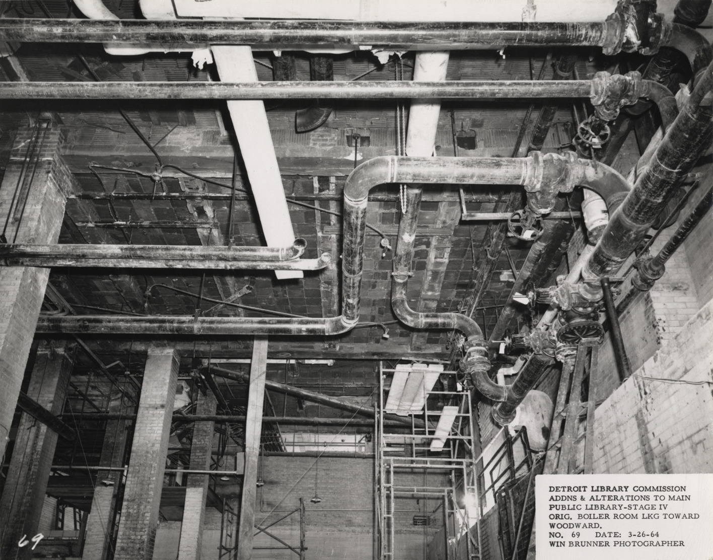 View of boiler room, Main Library, Detroit Public Library, showing pipes and valves overhead. Printed on front: "Detroit Library Commission. Addns & alterations to Main Public Library, Stage IV. F.H. Martin Const. Co., contr. Orig. boiler room lkg. toward Woodward. No. 69. Date: 3-26-64. Win Brunner, photographer."