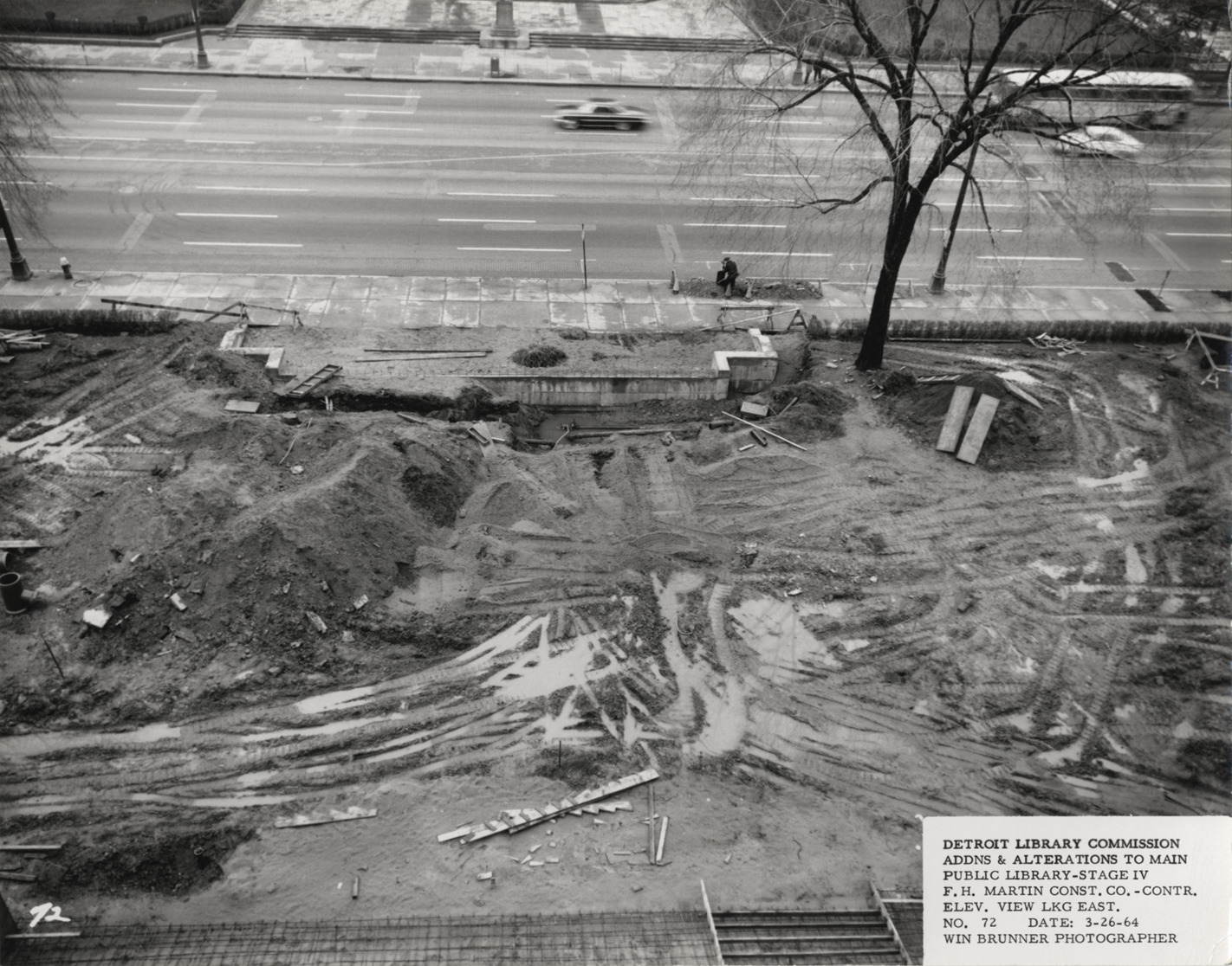 View of excavation of east side of Main Library, Detroit Public Library. Tire tracks, piles of earth and construction debris on lawn. Printed on front: "Detroit Library Commission. Addns & alterations to Main Public Library, Stage IV. F.H. Martin Const. Co., contr. Elev. view lkg. east. No. 72. Date: 3-26-64. Win Brunner, photographer."