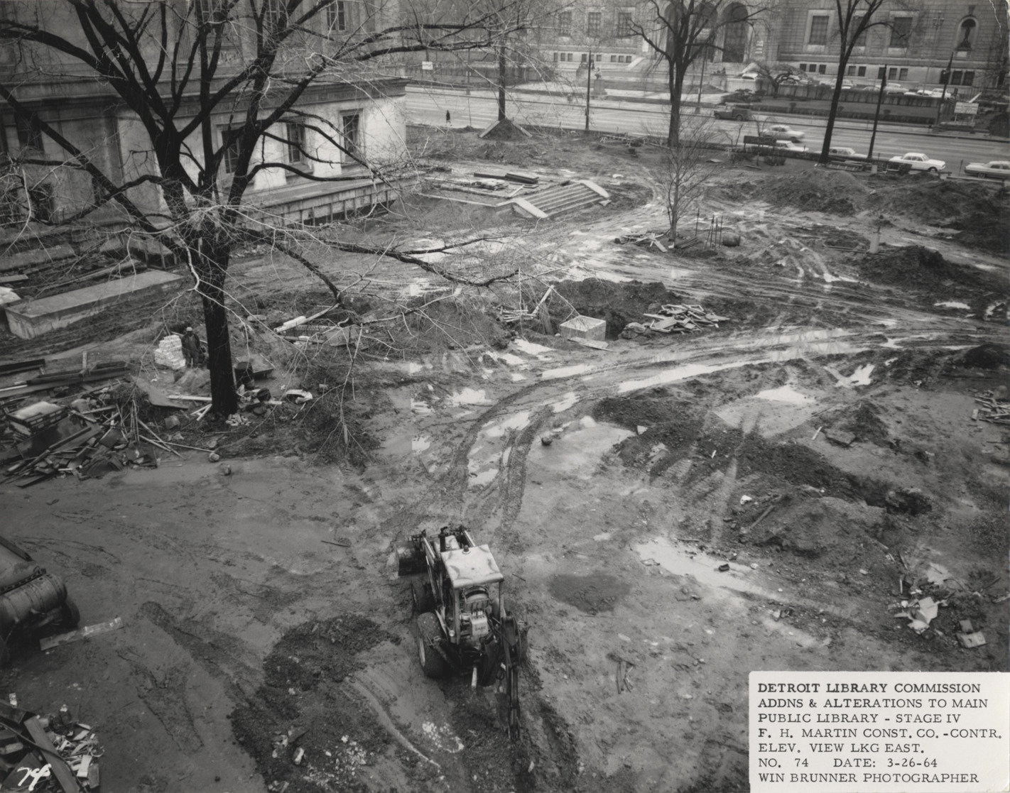 View of excavation on south side of Main Library, Detroit Public Library. Tire tracks, construction debris and several excavation trenches on lawn; bulldozer in foreground. Printed on front: "Detroit Library Commission. Addns & alterations to Main Public Library, Stage IV. F.H. Martin Const. Co., contr. Elev. view lkg. east. No. 74. Date: 3-26-64. Win Brunner, photographer."