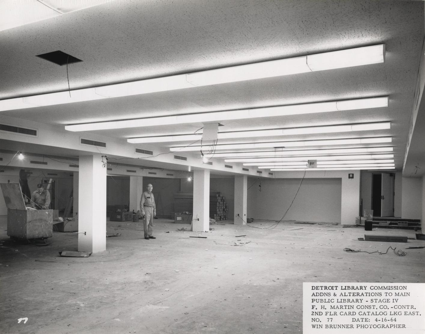View of second floor card catalog room of Main Library, Detroit Public Library during construction. Construction worker poses in center of room; another workman searches in bin. Overhead lights installed. Printed on front: "Detroit Library Commission. Addns & alterations to Main Public Library, Stage IV. F.H. Martin Const. Co., contr. 2nd flr. card catalog lkg. east. No. 77. Date: 4-16-64. Win Brunner, photographer."