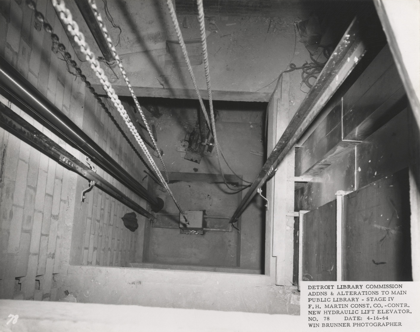 View down elevator shaft, Main Library, Detroit Public Library during construction. Printed on front: "Detroit Library Commission. Addns & alterations to Main Public Library, Stage IV. F.H. Martin Const. Co., contr. New hydraulic lift elevator. No. 78. Date: 4-16-64. Win Brunner, photographer."