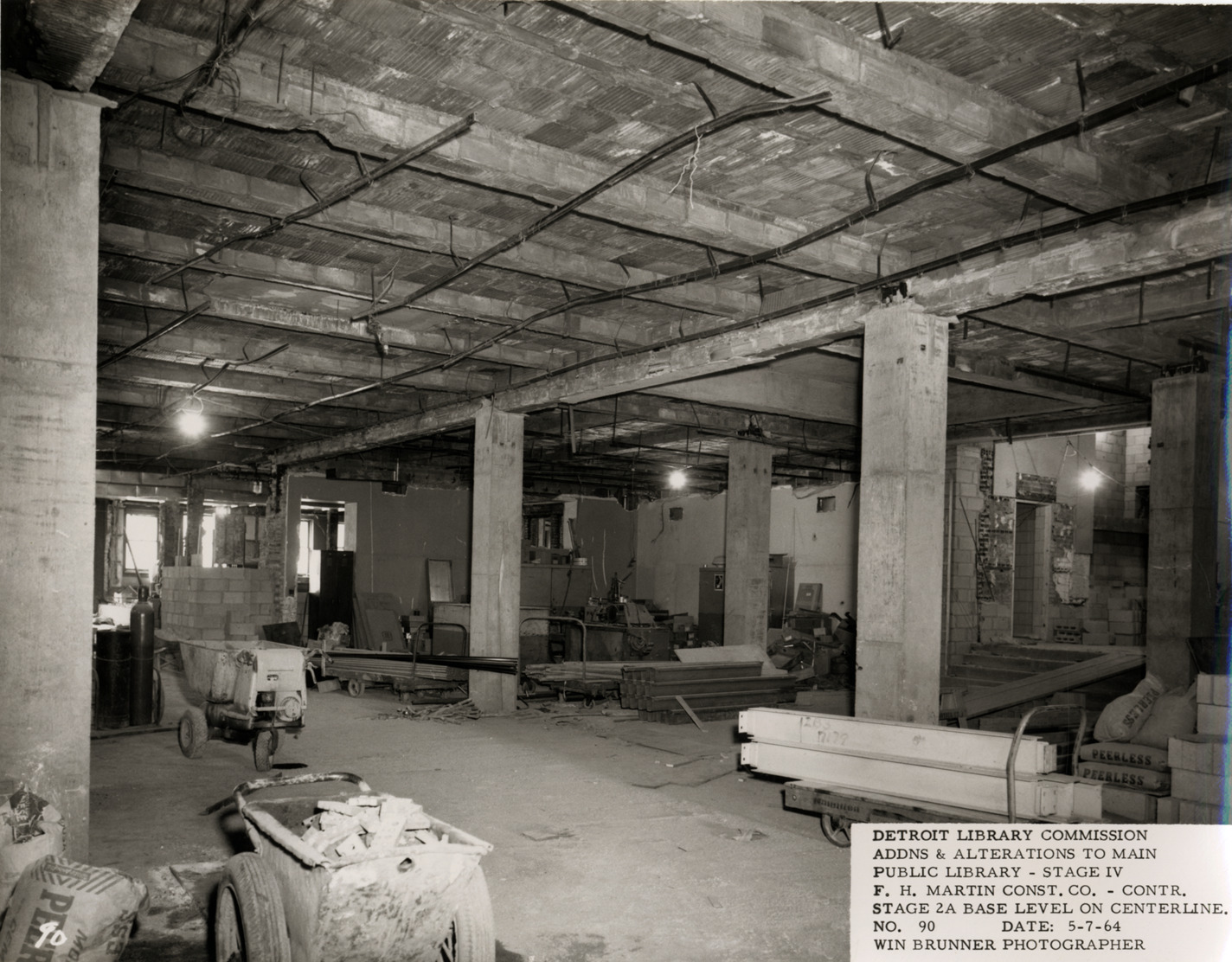 View of construction in basement, Main Library, Detroit Public Library. Wheelbarrow and construction materials in room. Printed on front: "Detroit Library Commission. Addns & alterations to Main Public Library, Stage IV. F.H. Martin Const. Co., contr. Stage 2A base level on centerline. No. 90. Date: 5-7-64. Win Brunner, photographer."