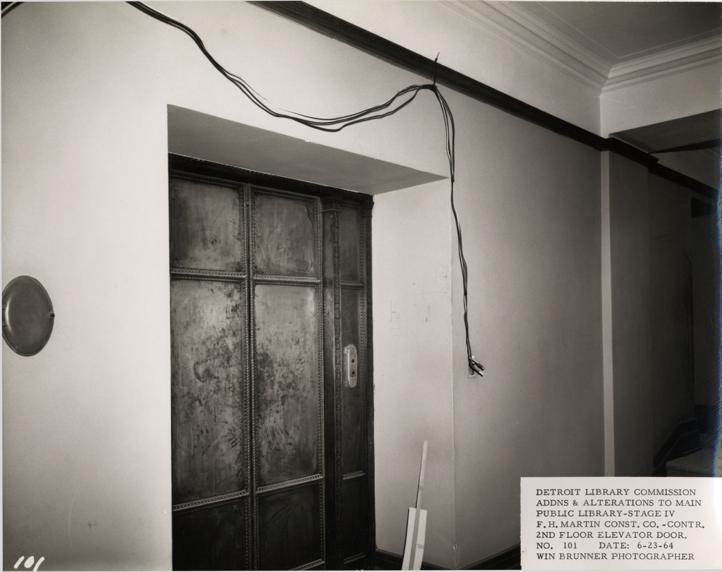 View of second floor elevator door, Main Library, Detroit Public Library. Printed on front: "Detroit Library Commission. Addns & alterations to Main Public Library, Stage IV. F.H. Martin Const. Co., contr. 2nd floor elevator door. No. 101. Date: 6-23-64. Win Brunner, photographer."