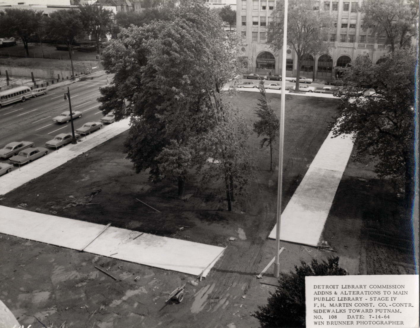 View of sidewalks at south end of Main Library, Detroit Public Library during construction. Printed on front: "Detroit Library Commission. Addns & alterations to Main Public Library, Stage IV. F.H. Martin Const. Co., contr. Sidewalks toward Putnam. No. 108. Date: 7-14-64. Win Brunner, photographer."