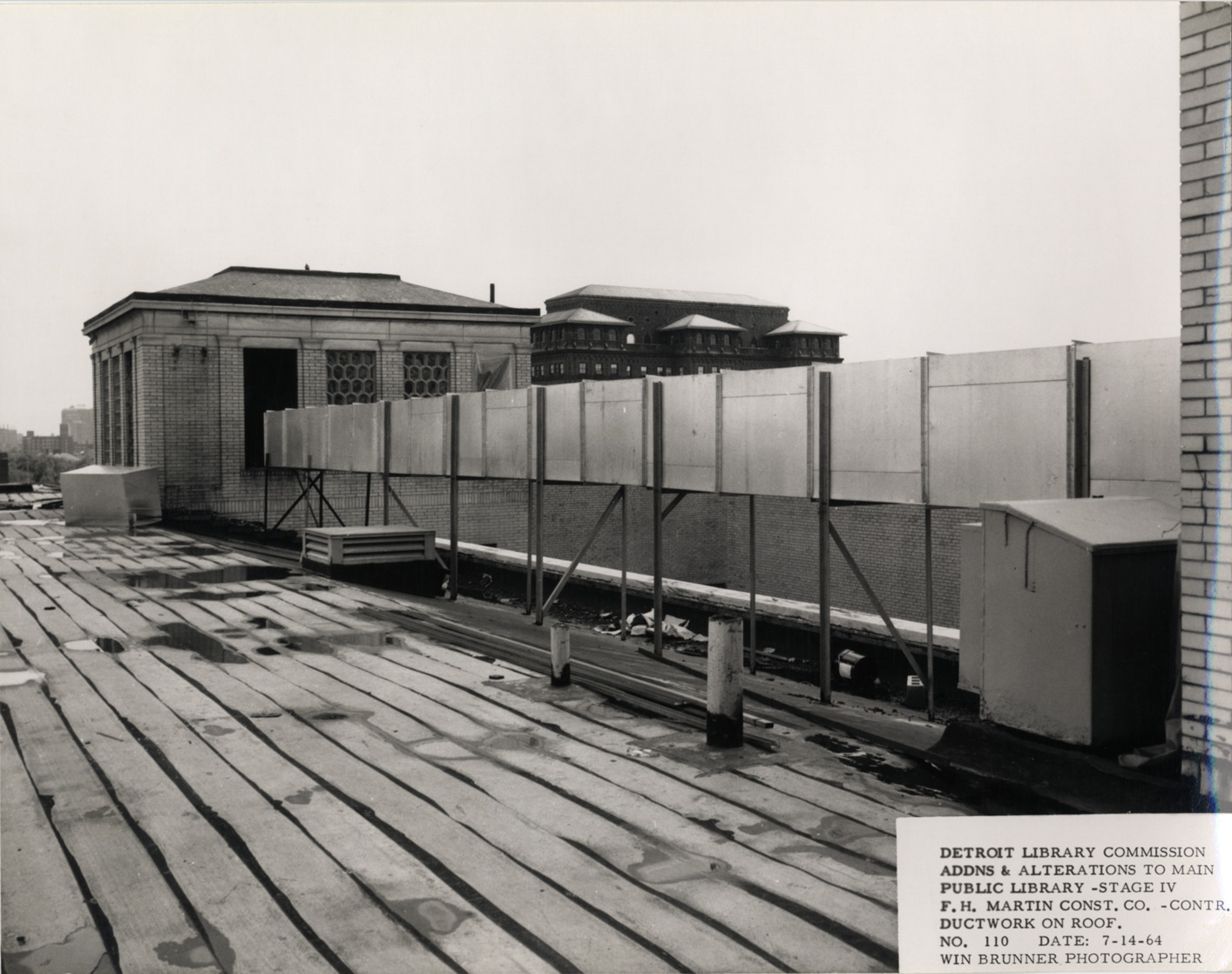 View of ductwork on roof near penthouse, Main Library, Detroit Public Library during construction. Printed on front: "Detroit Library Commission. Addns & alterations to Main Public Library, Stage IV. F.H. Martin Const. Co., contr. Ductwork on roof. No. 110. Date: 7-14-64. Win Brunner, photographer."