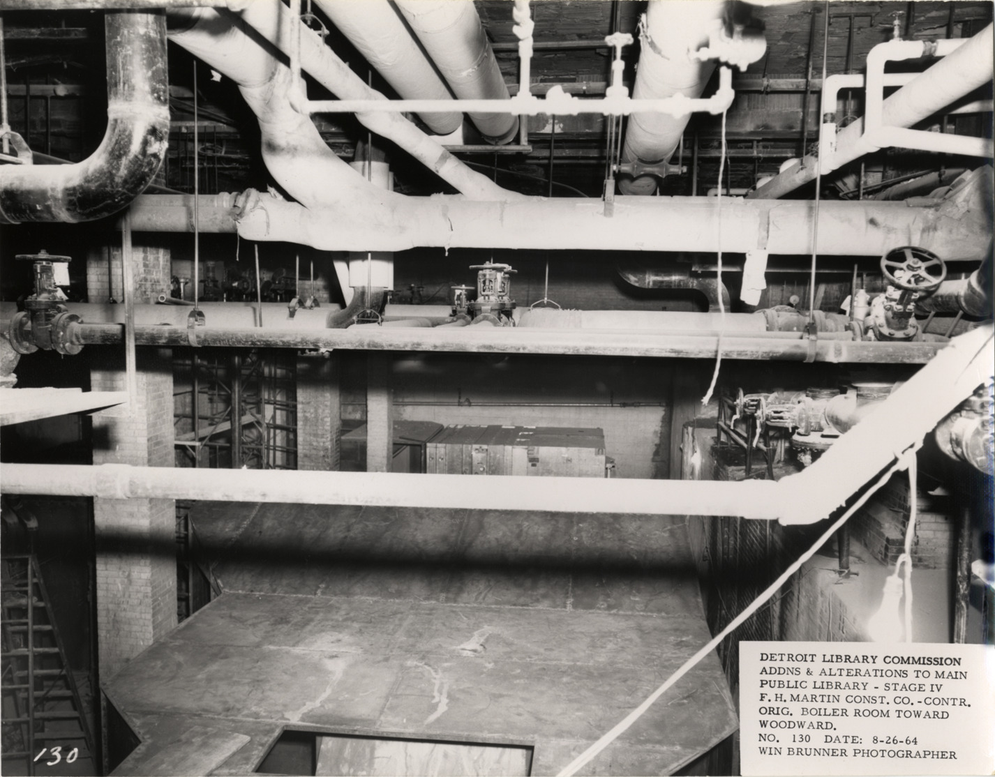 View of pipes in original boiler room, Main Library, Detroit Public Library during construction. Printed on front: "Detroit Library Commission. Addns & alterations to Main Public Library, Stage IV. F.H. Martin Const. Co., contr. Orig. boiler room toward Woodward. No. 130. Date: 8-26-64. Win Brunner, photographer."