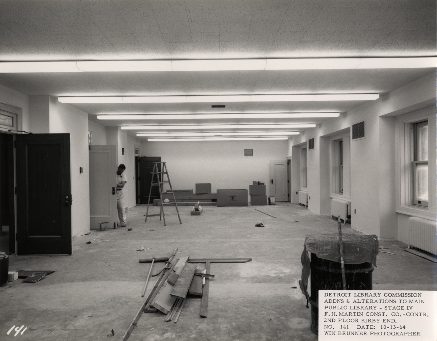 View of second floor room, Main Library, Detroit Public Library during construction. Construction worker fixes door; ladder and construction materials in room. Printed on front: "Detroit Library Commission. Addns & alterations to Main Public Library, Stage IV. F.H. Martin Const. Co., contr. 2nd floor Kirby end. No. 141. Date: 10-13-64. Win Brunner, photographer."