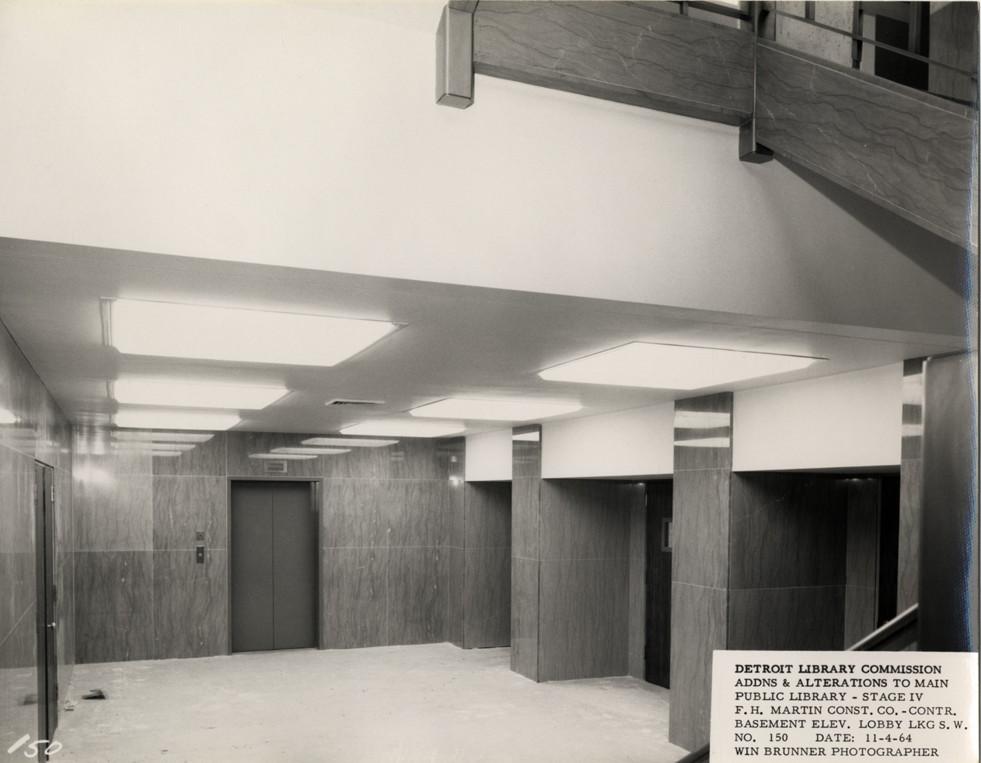 View of elevator in basement lobby, Main Library, Detroit Public Library. Printed on front: "Detroit Library Commission. Addns & alterations to Main Public Library, Stage IV. F.H. Martin Const. Co., contr. Basement elev. lobby lkg. s.w. No. 150. Date: 11-4-64. Win Brunner, photographer."