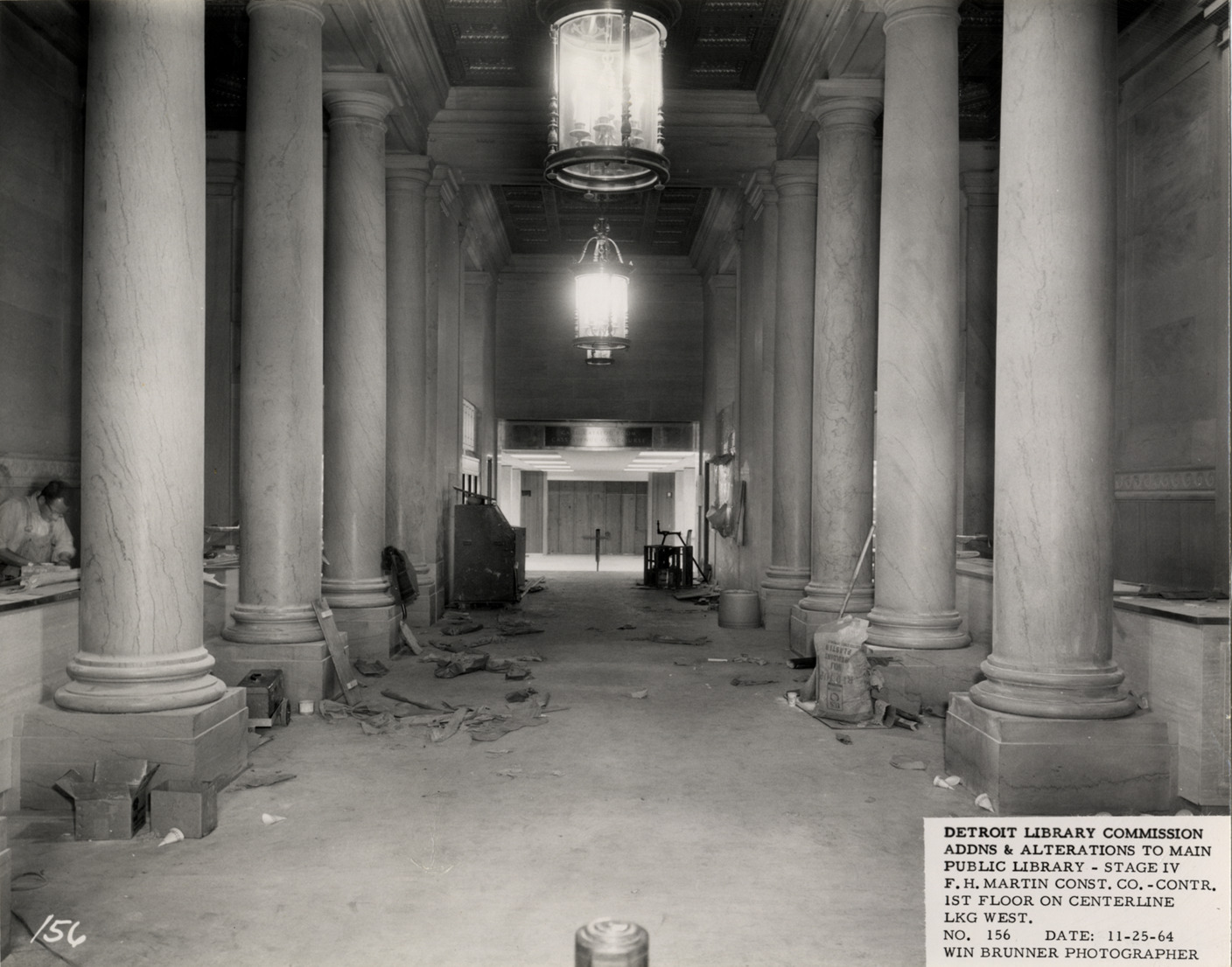View of main hallway, Main Library, Detroit Public Library during construction. Columns line corridor; construction materials on floor. Printed on front: "Detroit Library Commission. Addns & alterations to Main Public Library, Stage IV. F.H. Martin Const. Co., contr. 1st floor on centerline lkg. west. No. 156. Date: 11-25-64. Win Brunner, photographer."