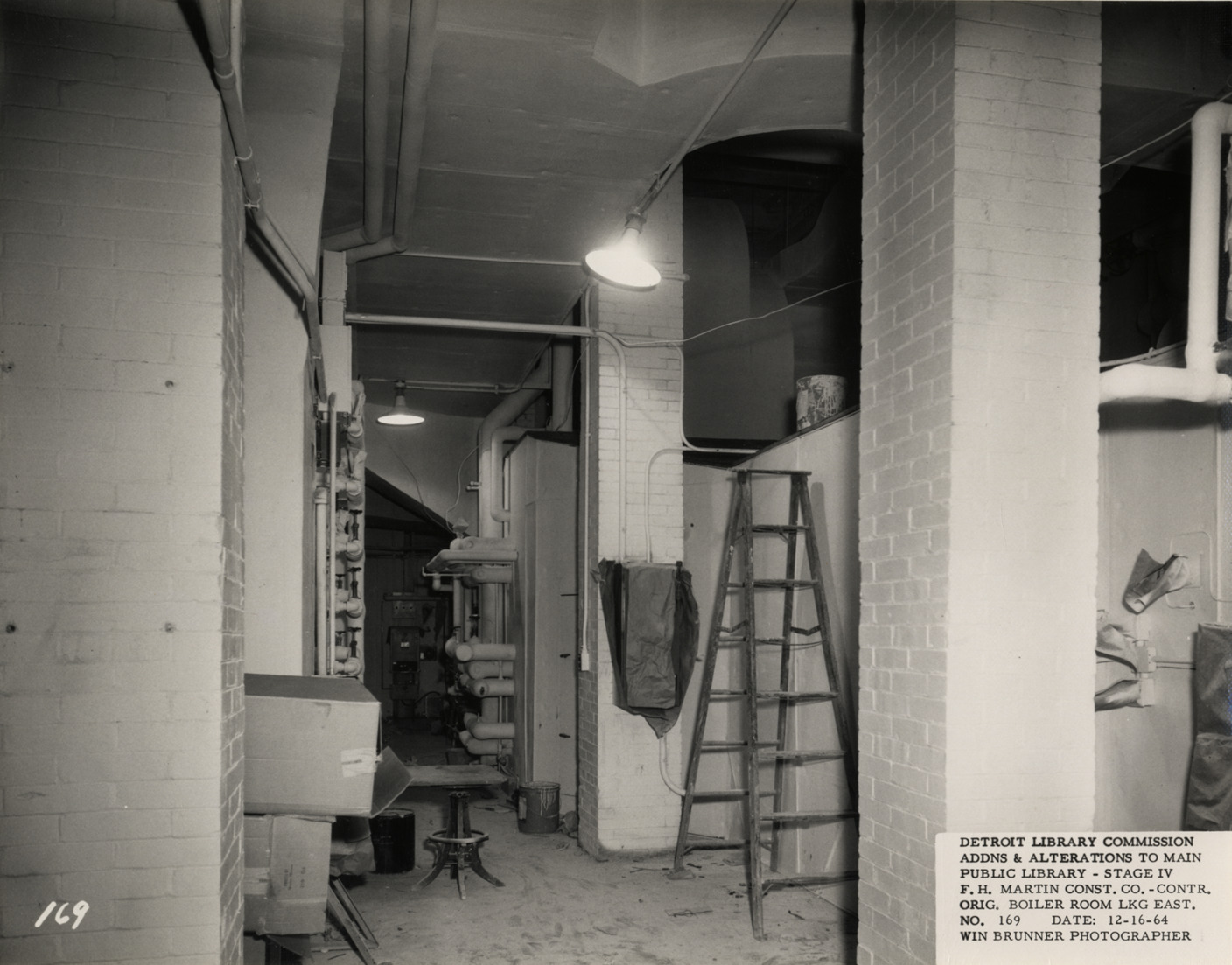 View of boiler room, Main Library, Detroit Public Library. Ladder in foreground. Printed on front: "Detroit Library Commission. Addns & alterations to Main Public Library, Stage IV. F.H. Martin Const. Co., contr. Original boiler room lkg. east. No. 169. Date: 12-16-64. Win Brunner, photographer."