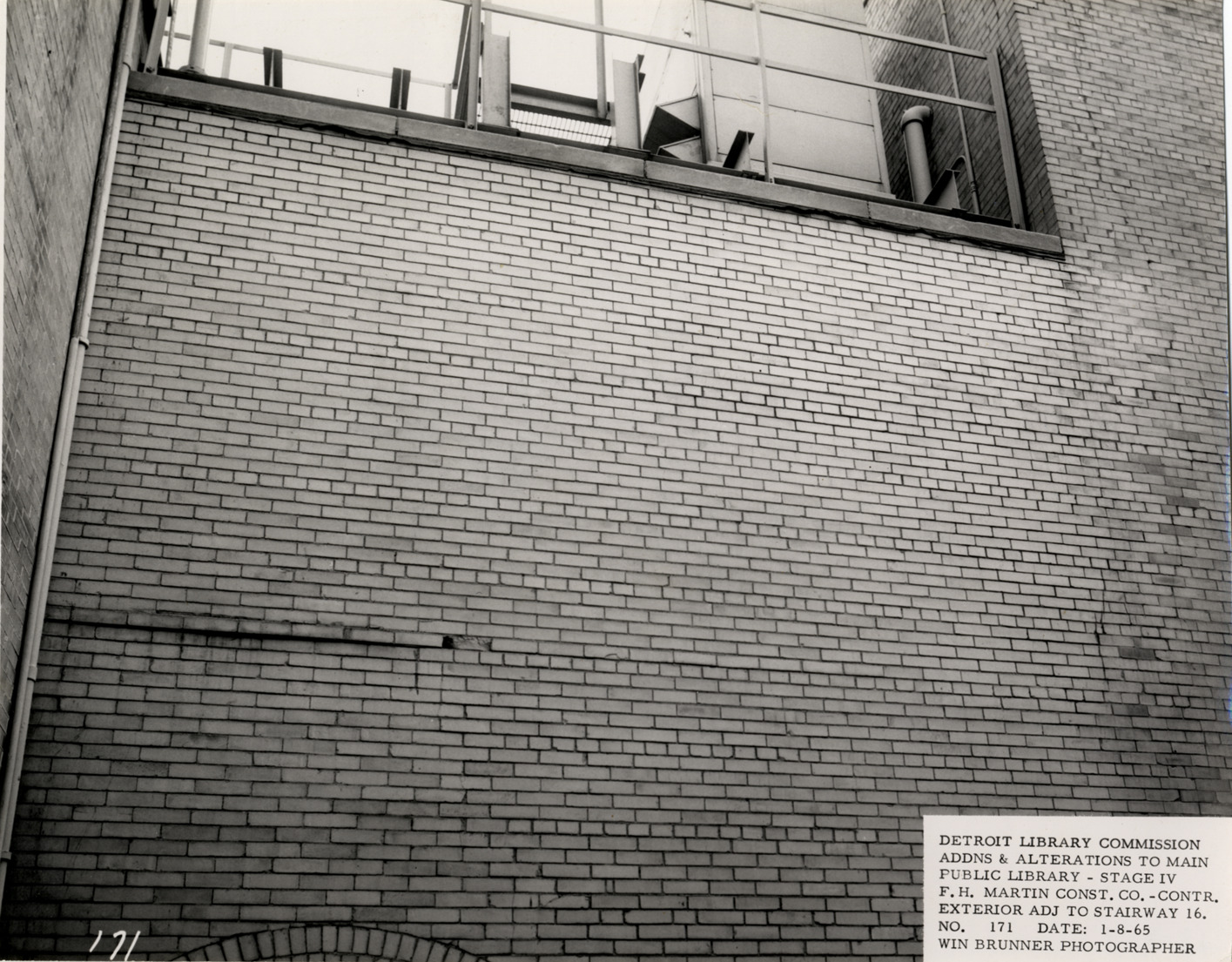 View of exterior brick wall, Main Library, Detroit Public Library. Printed on front: "Detroit Library Commission. Addns & alterations to Main Public Library, Stage IV. F.H. Martin Const. Co., contr. Exterior adj. to stairway 16. No. 171. Date: 1-8-65. Win Brunner, photographer."