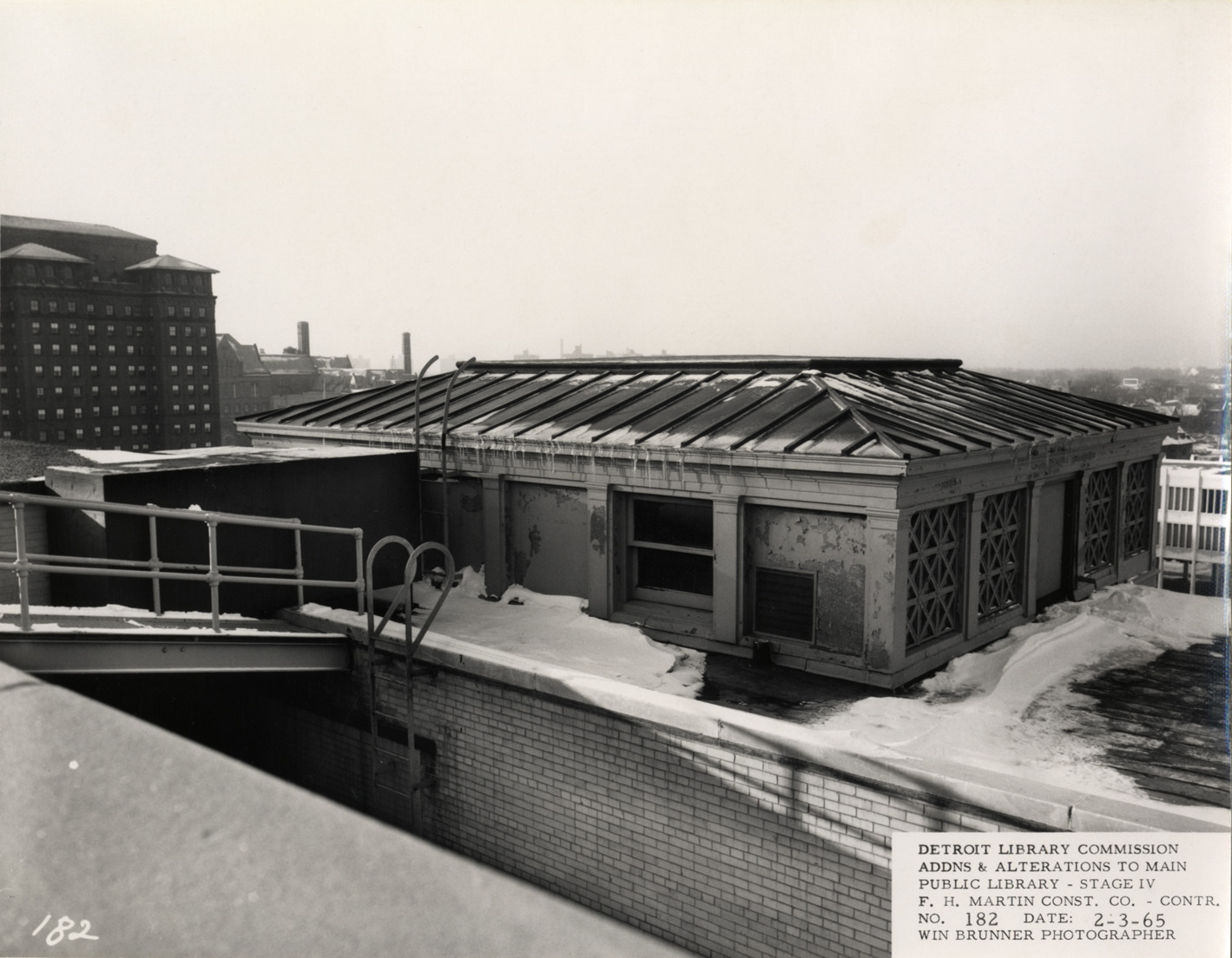 View of penthouse, Main Library, Detroit Public Library. Snow on roof. Printed on front: "Detroit Library Commission. Addns & alterations to Main Public Library, Stage IV. F.H. Martin Const. Co., contr. No. 182. Date: 2-3-65. Win Brunner, photographer."