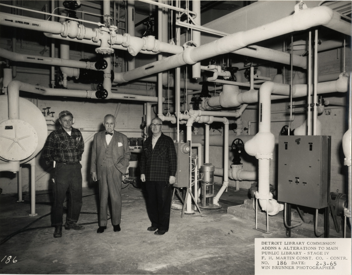 View of three men in pump room of sub-basement, Main Library, Detroit Public Library. Hot water tank and sump pumps visible. Printed on front: "Detroit Library Commission. Addns & alterations to Main Public Library, Stage IV. F.H. Martin Const. Co., contr. No. 186. Date: 2-3-65. Win Brunner, photographer."