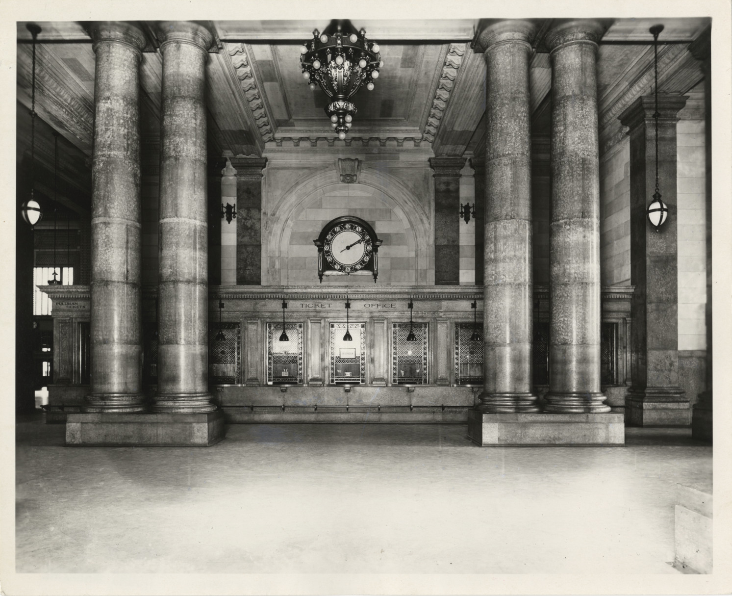 View of ticket office at Michigan Central Railroad Station, framed by columns. Clock displayed on wall. Printed on back: "35. Looking west toward ticket windows and ticket lobby. Noticeable fault of design is the way some windows are jammed behind huge columns with no room for ticket lines. Note also paucity of signs. Circa 1916." Stamped on back: "From the Manning Bros. collection. Manning Bros. commercial photographers, 16300 Brush Street, Highland Park 3, Mich."