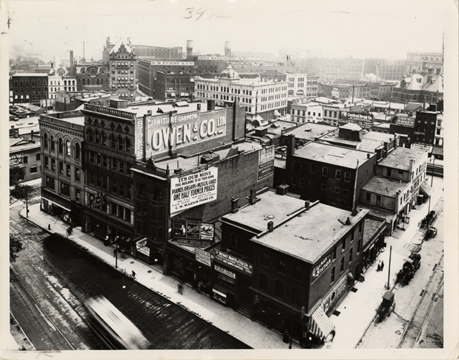 Bird's-eye view of buildings at southeast corner of Gratiot and Farmer Streets. Buildings include Owen & Co., C.W. Marvin Piano Co., Detroit Mantel & Tile Co. and Gillman Station. Handwritten on back: "S.E. corner Gratiot & Farmer showing Crowley-Milner site. View is east along s. side of Gratiot. [undecipherable] at s.e. corner Gratiot and Farmer ... in right foreground Pub. Library n. side of Gratiot (not seen), s.w. corner Gratiot and Library at left. Date 1905. Det. Mantel & Tile moved to ... this year ... sign on storefront."