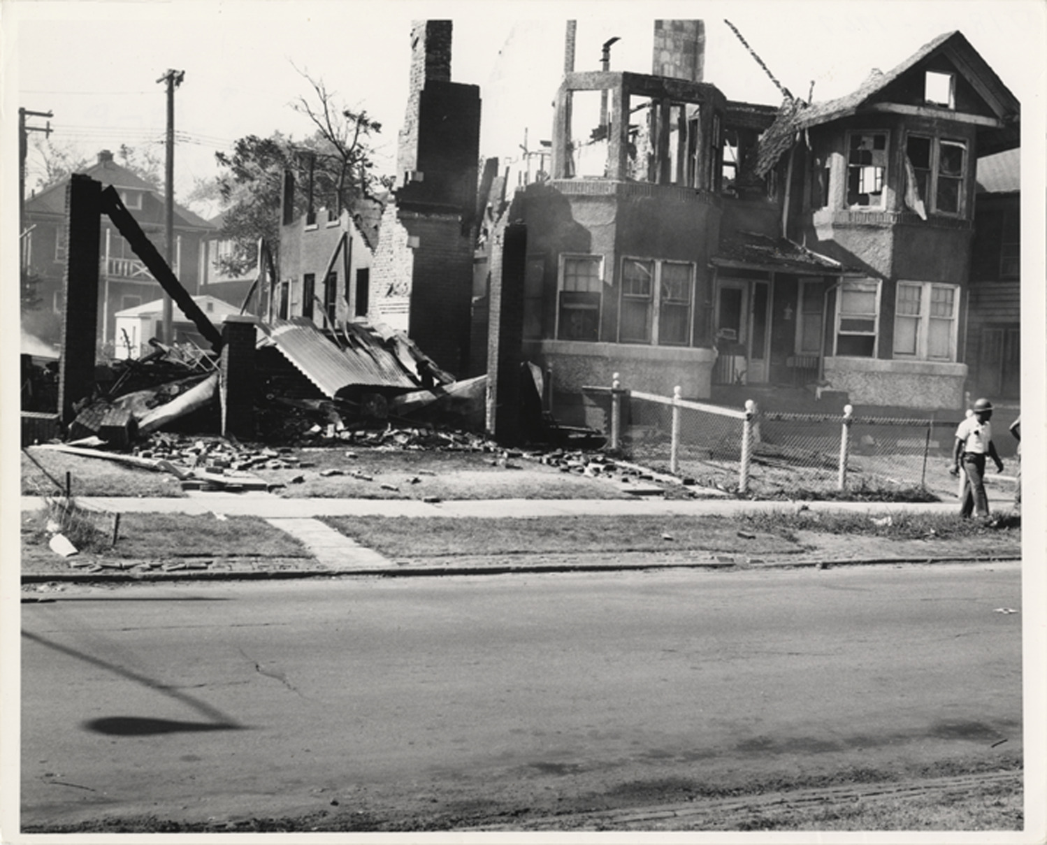 Favorite this☆ Destroyed houses Description: View of houses destroyed by fire on Warren near Junction during 1967 riots in Detroit. Handwritten on back: "Warren near Junction, July 25, 1967." Details Resource ID: bh007331 Subject: Riots--Michigan--Detroit Lost architecture--Michigan--Detroit Brick houses--Fires and fire prevention--Michigan--Detroit Photographic prints Date Issued: 1967-07-25 Format: 1 photographic print ; 8 x 10 in. Member of: Burton Historical Collection Filing Location: D/Riots-1967 Rights: Physical rights are retained by DPL. Copyright is retained in accordance with U.S. copyright laws.