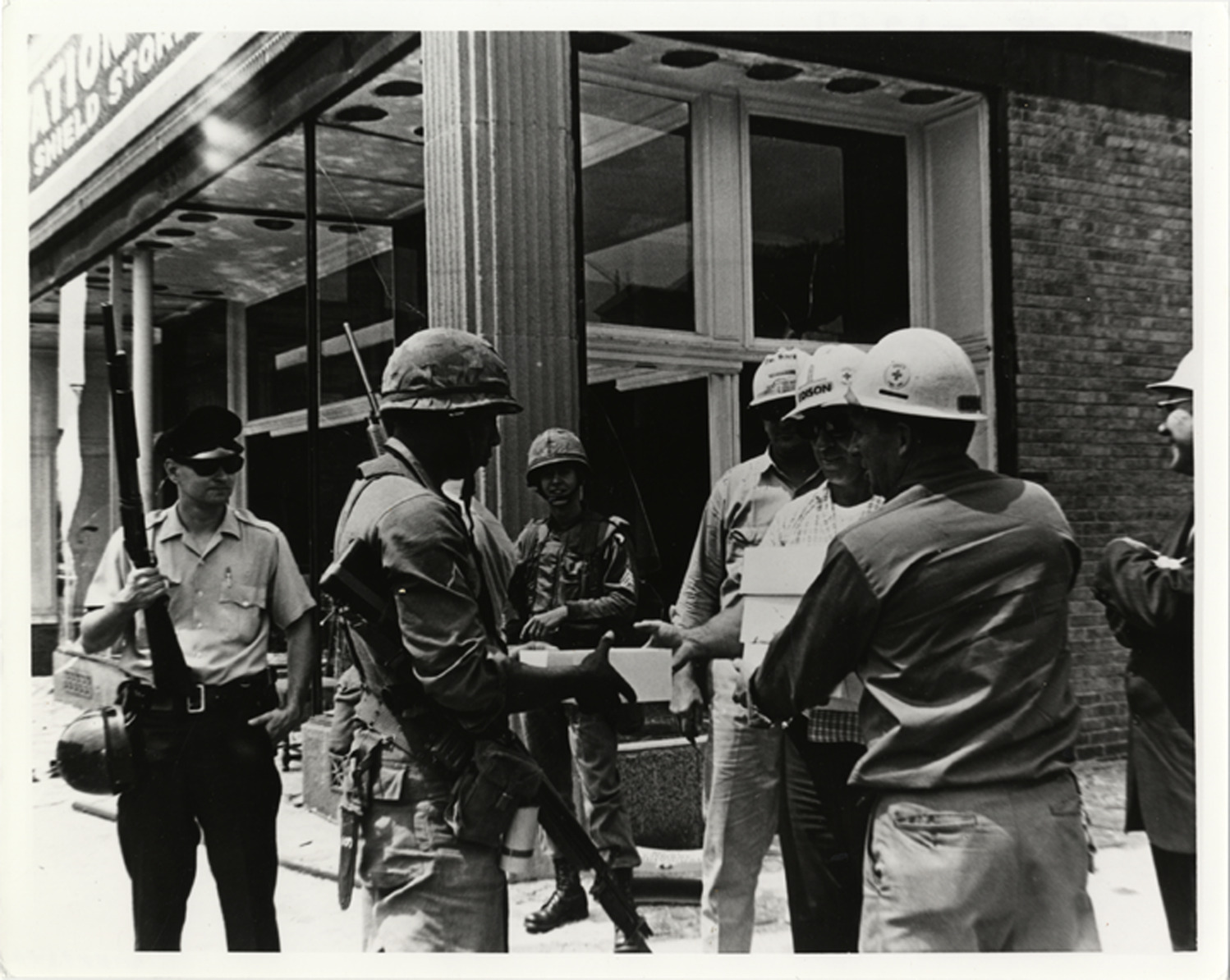 Workers giving box to soldier Description: View of workers wearing hardhats giving a box to soldier during 1967 riots in Detroit. Details Resource ID: bh007342 Subject: Riots--Michigan--Detroit Soldiers Photographic prints Date Issued: 1967 Format: 1 photographic print ; 8 x 10 in. Member of: Burton Historical Collection Filing Location: D/Riots-1967 Rights: Physical rights are retained by DPL. Copyright is retained in accordance with U.S. copyright laws.