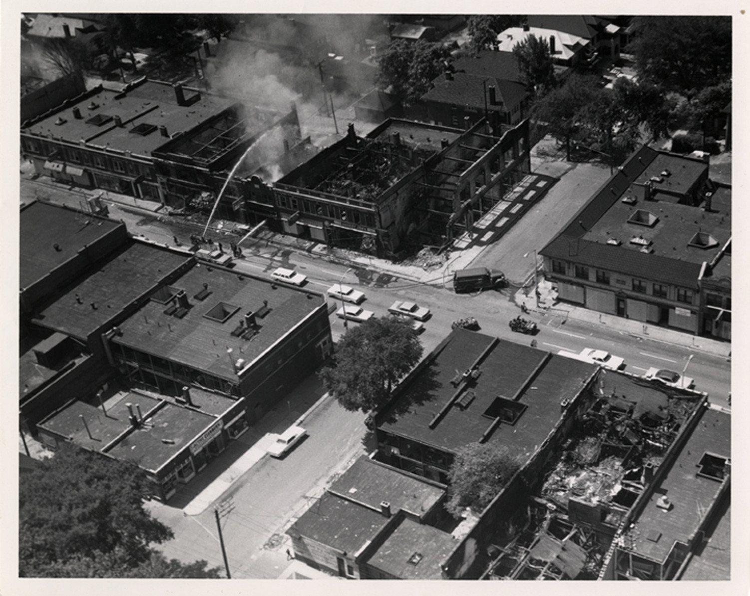 Favorite this☆ Firefighters extinguishing fire Description: View of firefighters extinguishing fire on commercial block during 1967 riots in Detroit. Firetruck in intersection. Details Resource ID: bh007349 Subject: Riots--Michigan--Detroit Lost architecture--Michigan--Detroit Commercial buildings--Fires and fire prevention--Michigan--Detroit Fire extinction--Michigan--Detroit Photographic prints Date Issued: 1967 Format: 1 photographic print ; 8 X 10 in. Member of: Burton Historical Collection Filing Location: D/Riots-1967 Rights: Physical rights are retained by DPL. Copyright is retained in accordance with U.S. copyright laws.
