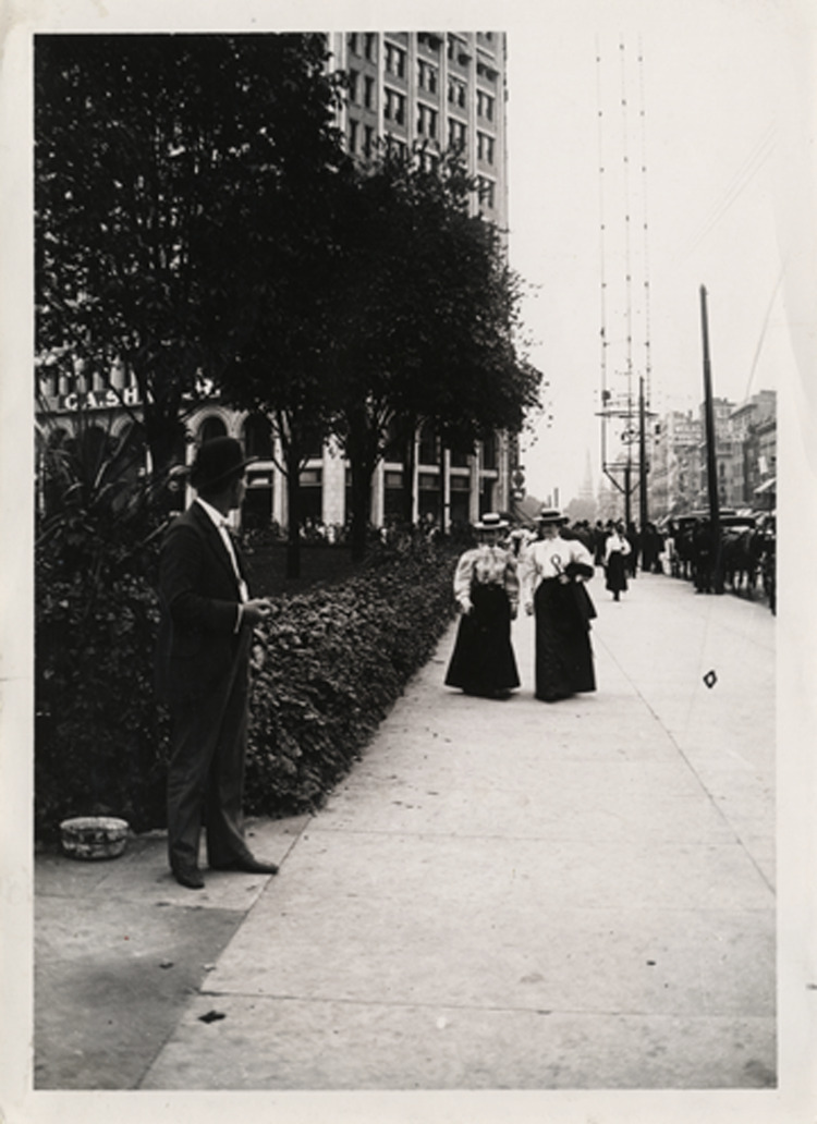 Favorite this☆ Two women walking on Woodward Avenue Description: View of two women walking on sidewalk along Woodward Avenue. Man stands in foreground. Handwritten on back: "c.1894." Details Resource ID: bh007358 Subject: Woodward Avenue (Mich.) Streets--Michigan--Detroit Sidewalks--Michigan--Detroit Women--Michigan--Detroit Photographic prints Date Issued: 1894 (year approximate) Format: 1 photographic print ; 7 x 5 in. Member of: Burton Historical Collection Filing Location: D/Streets-Woodward Ave. Negative Number: BHC glass neg. no. 2568 Rights: Physical rights are retained by DPL. Copyright is retained in accordance with U.S. copyright laws.