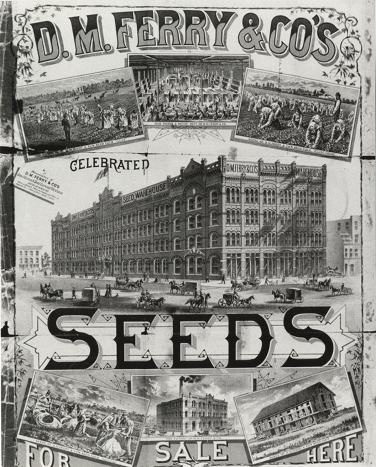 Poster advertising D.M. Ferry & Co. seeds. Images include seed warehouse, box factory, employees working at seed farm and mail order department. Printed on front: "D.M. Ferry & Co.'s celebrated seeds for sale here." Printed on back: "1882 poster, D.M. Ferry & Co. Warehouse A, erected in 1879. Brush & Monroe, burned 1886. Original 16" x 24" at Detroit Historical Museum."
